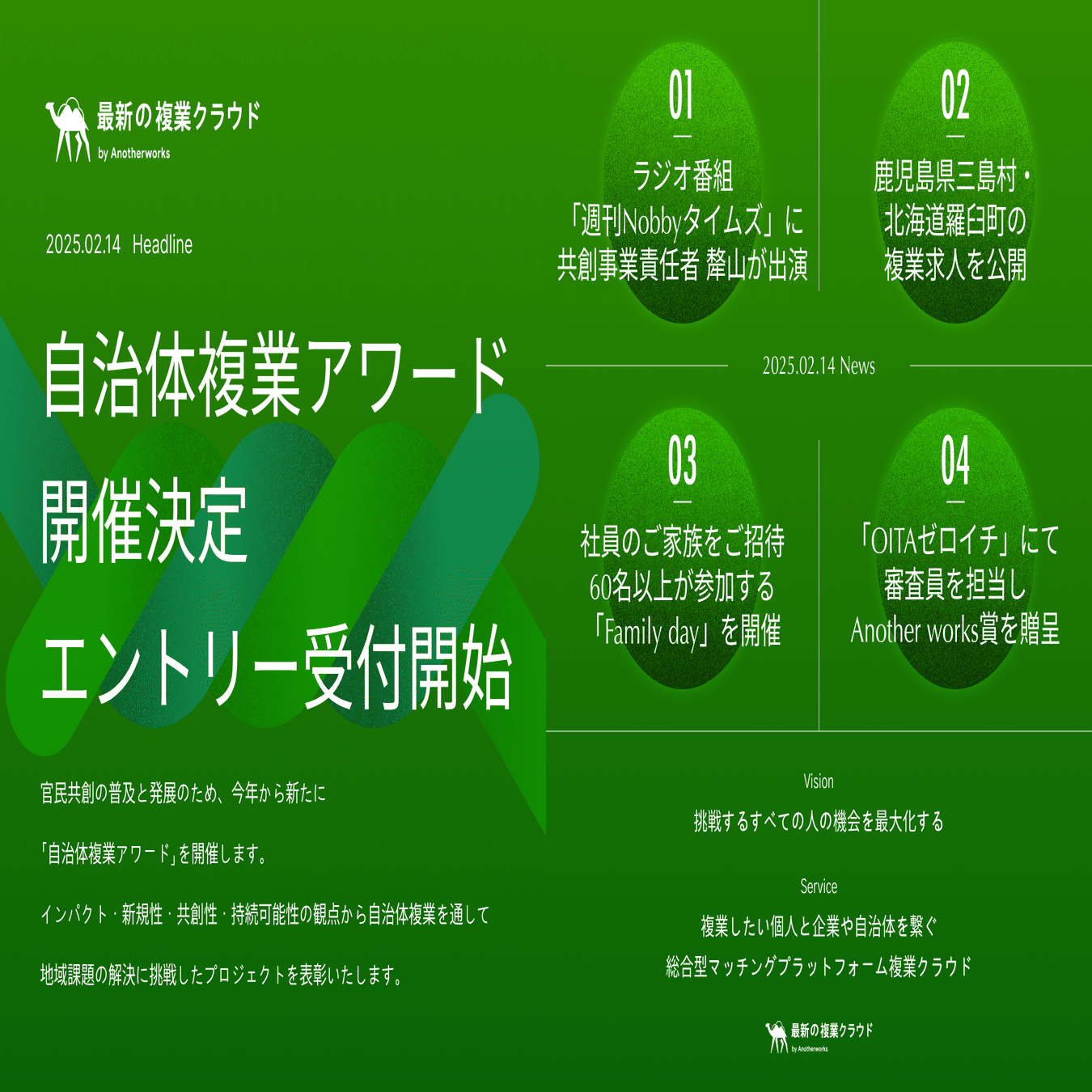 自治体複業アワード2025の開催決定、エントリー受付を開始!官民共創の普及と発展を目指し、複業人材・自治体職員の”挑戦”にスポットライトを株式会社Another worksのプレスリリース(2025年2月14日 09時00分)
