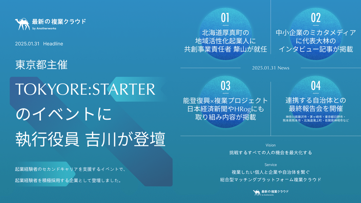 Another worksは、複業が当たり前の社会を目指し挑戦を続ける企業です。1月から3月は一般社団法人能登乃國百年之計と連携し能登復興 × 複業プロジェクトを開始したり、自治体複業を通して地域課題の解決に挑戦したプロジェクトを表彰したりなど新しい取り組みもスタートしました。プレスリリースを通じて3ヶ月を振り返ります。