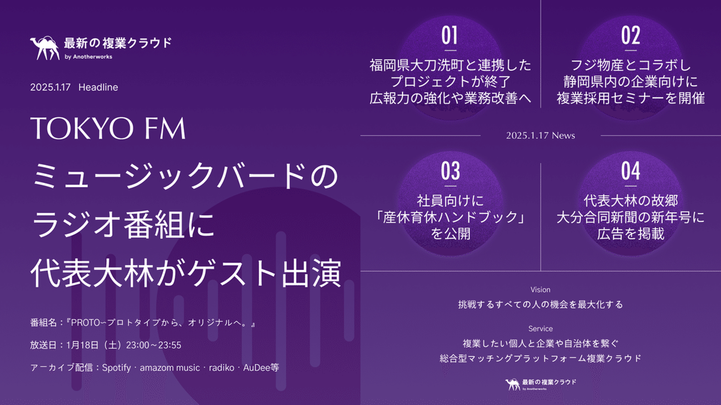 【1/22(水)14時~】フジ物産社と連携し、静岡県内の企業向けに複業採用セミナーを開催株式会社Another worksのプレスリリース(2025年1月15日 10時00分)