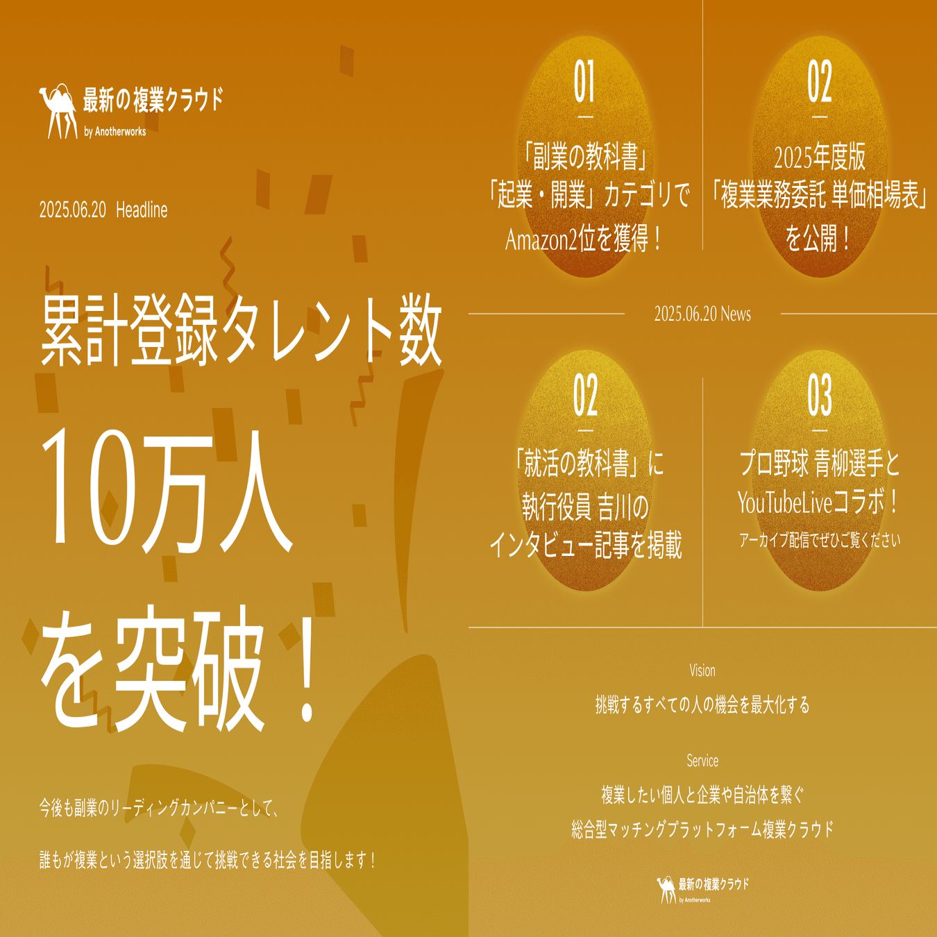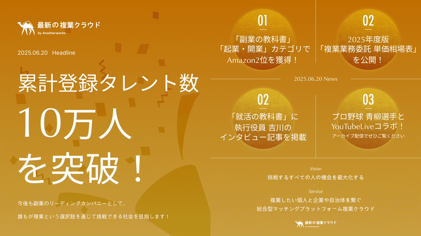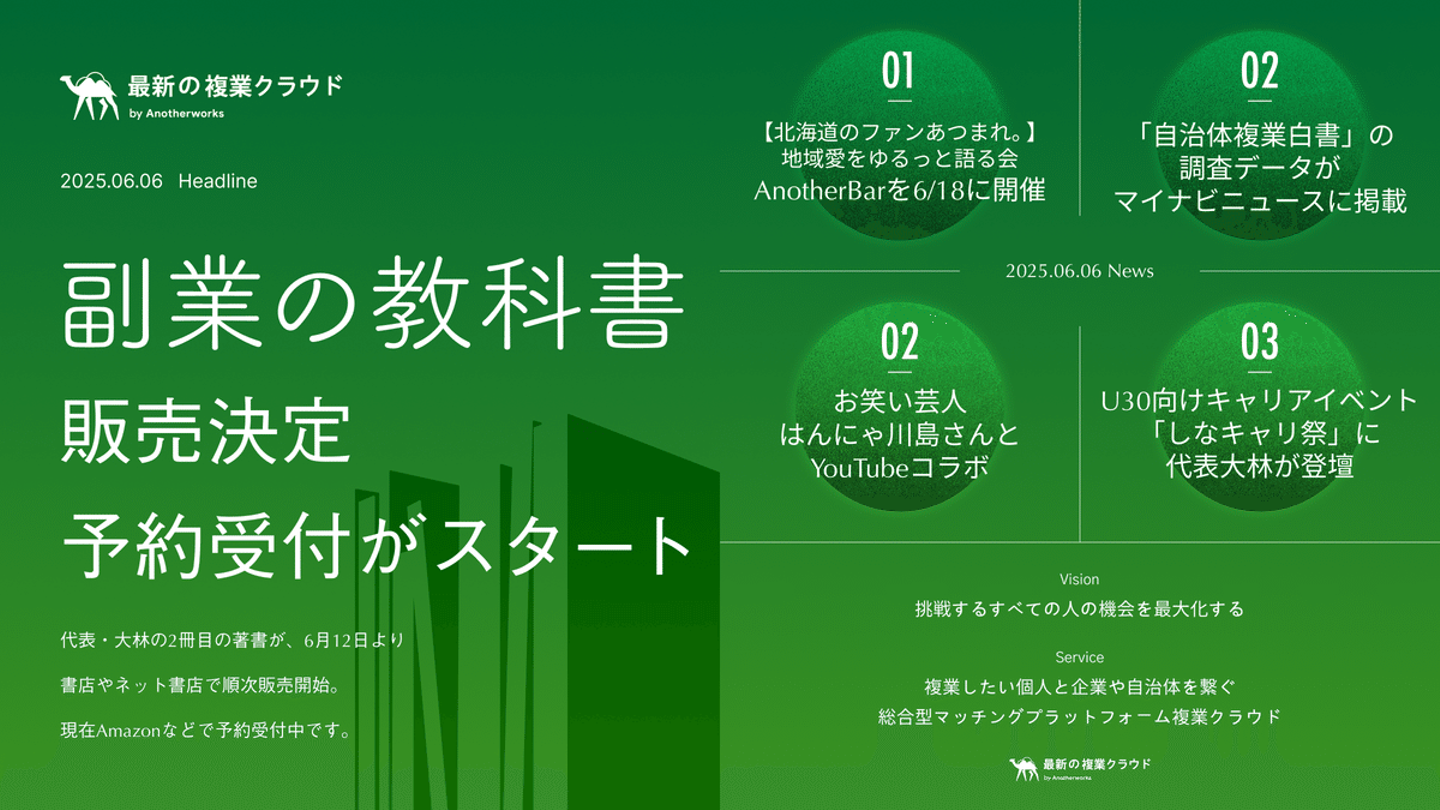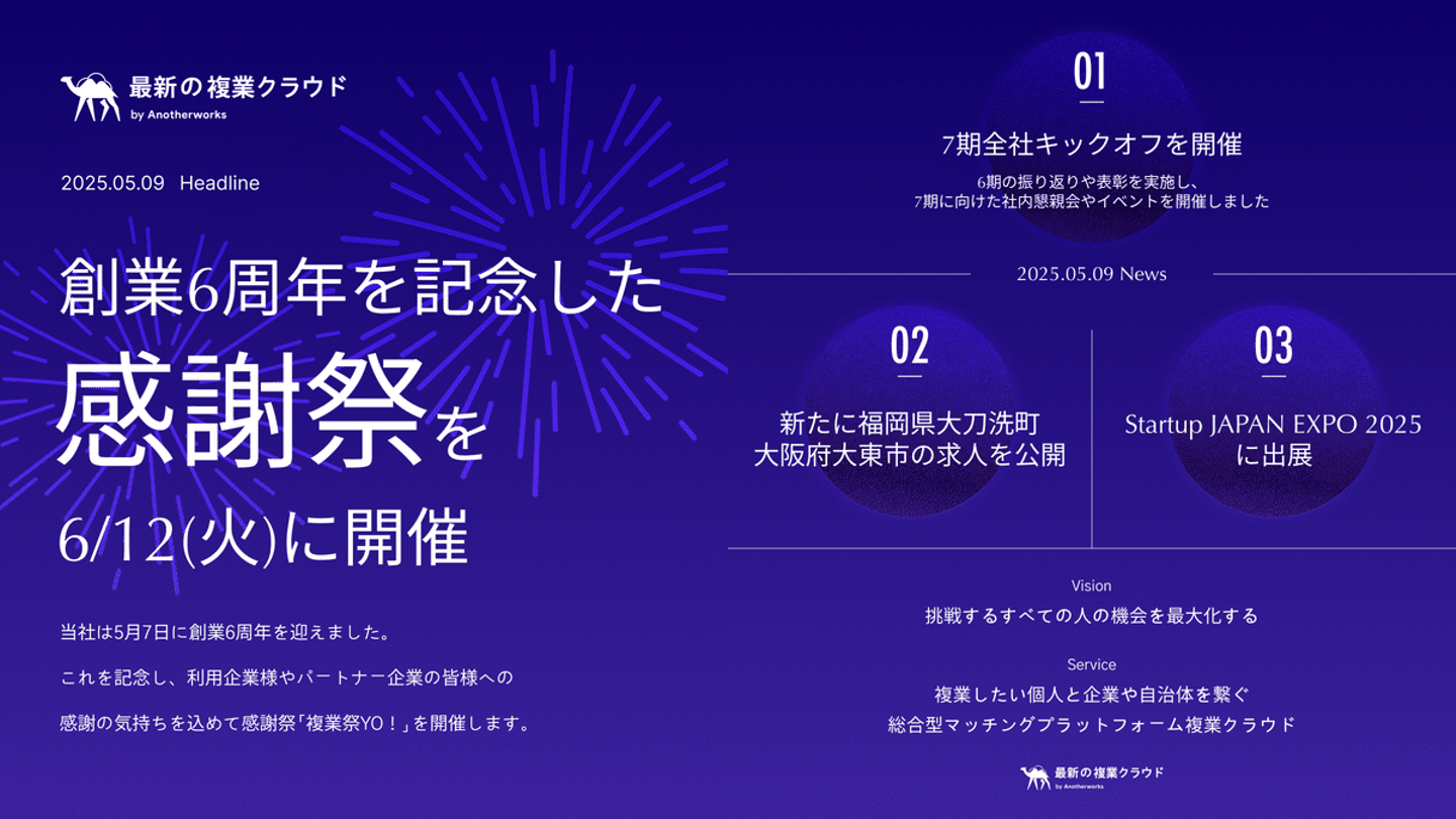 Another worksは、複業が当たり前の社会を目指し挑戦を続ける企業です。4月から6月は、日頃よりお世話になっている利用企業様やパートナー企業の皆様への感謝の気持ちを込めて「感謝祭」を開催いたしました。また書籍『年収UP・起業・自己実現できる!副業の教科書』を刊行いたしました。プレスリリースを通じて3ヶ月を振り返ります。