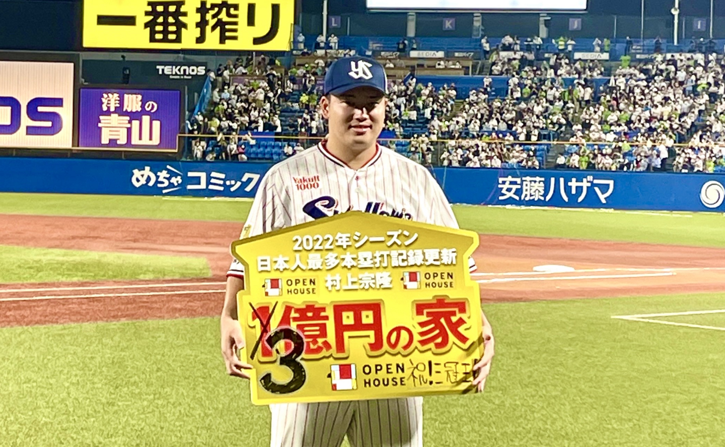 結果として、レギュラーシーズン最終戦・最終打席で、村上選手は56本目のホームランを見事に打って、58年ぶりの日本選手記録を更新しました。当初予定していた1億円の家を大幅に増額して、なんと3億円の家をプレゼントしたのも、オープンハウスらしい結末だったと感じています。
