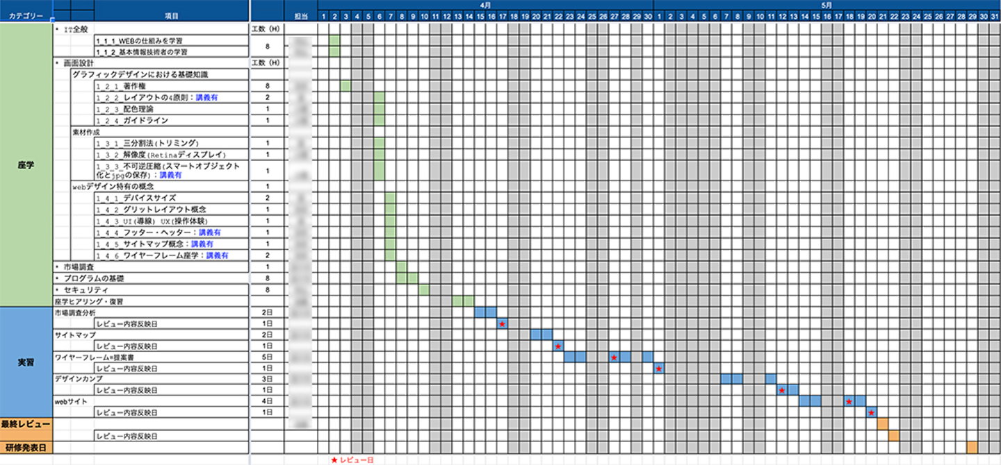 また、工程ごとにレビュー日(スケジュール表の赤い星マーク)が