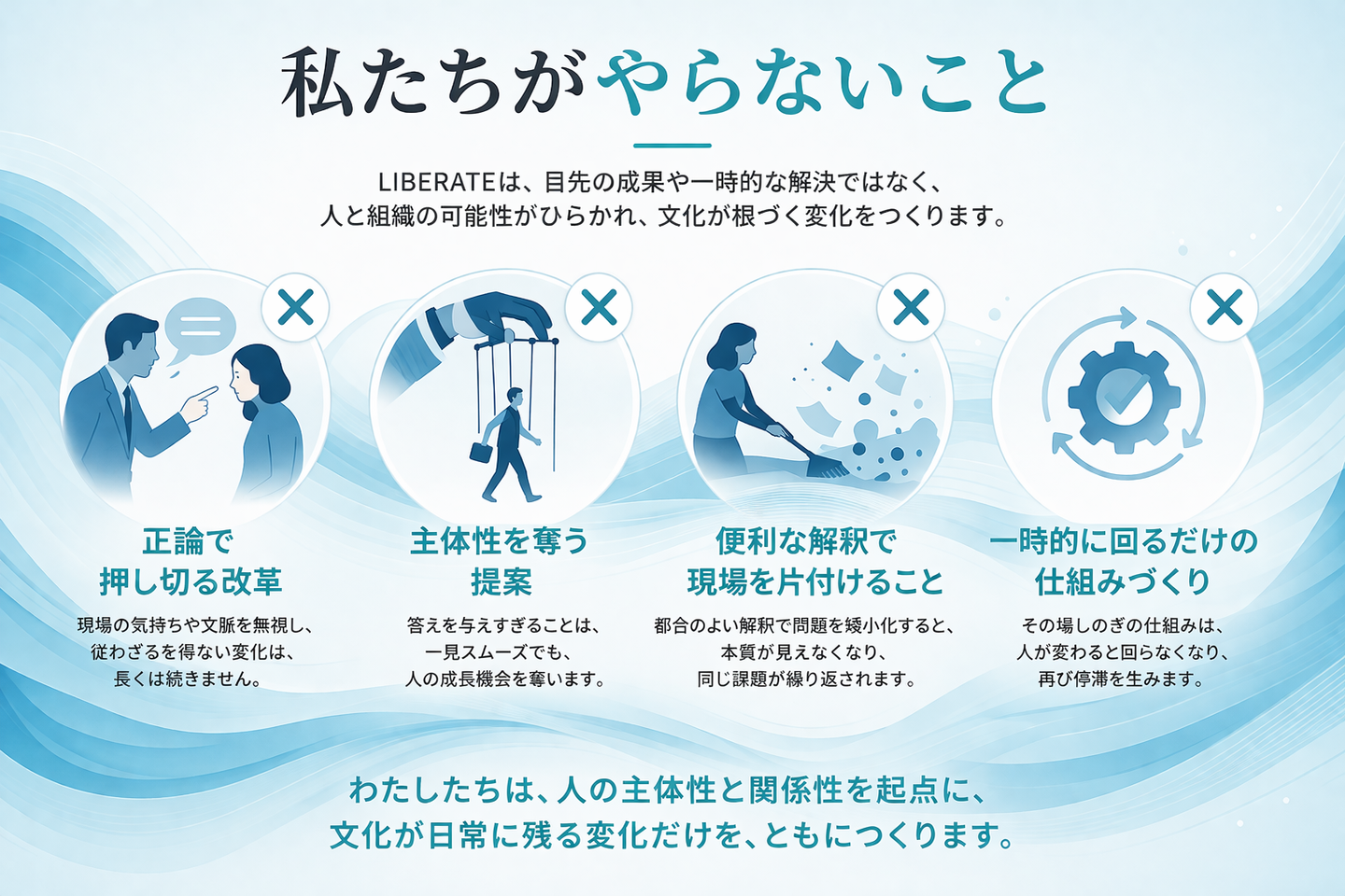 「業務(仕組み・制度)」を変えても戻る。「文化(人・組織)」を変えても回らない。 ならば、この両方を同時に、同じ熱量で整える場が必要だ。そう考え、私はLIBERATEを設立しました。