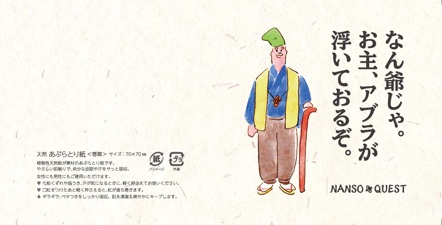 本年度のノベルティの中でも、学生さんに特にウケているのがこちら。あっちへこっちへと動き回る忙しい就職活動には欠かせない、あぶらとり紙です。なん爺のちょっと失礼(?)なコピーも好評です。