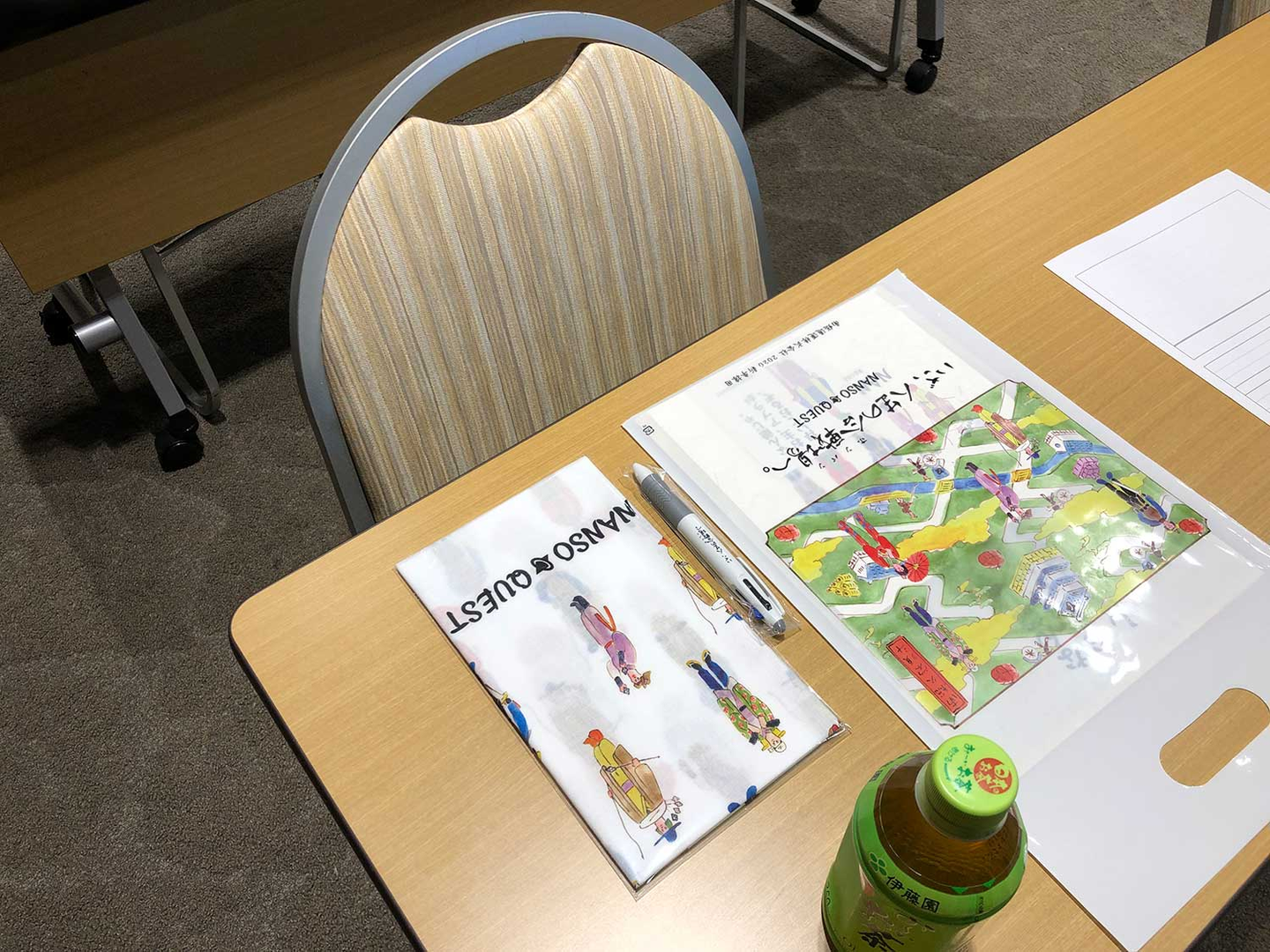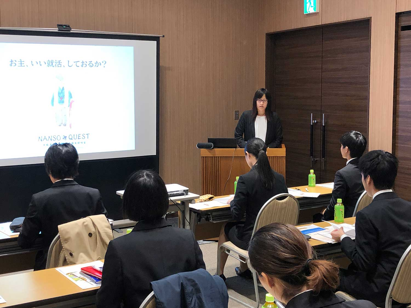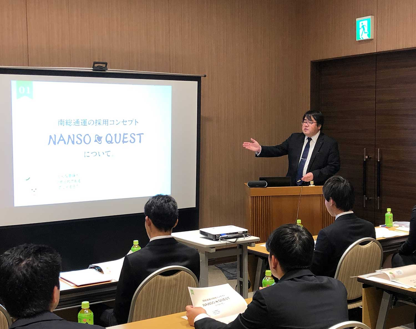 南総通運の採用コンセプト「NANSO★QUEST」についての説明。「いい条件の会社に入ることよりも、どんな人生を送りたいかを考えよう」という切り口に、大きく頷く学生さんも。