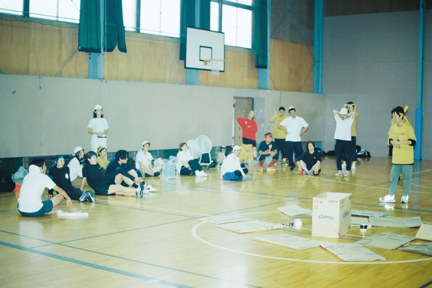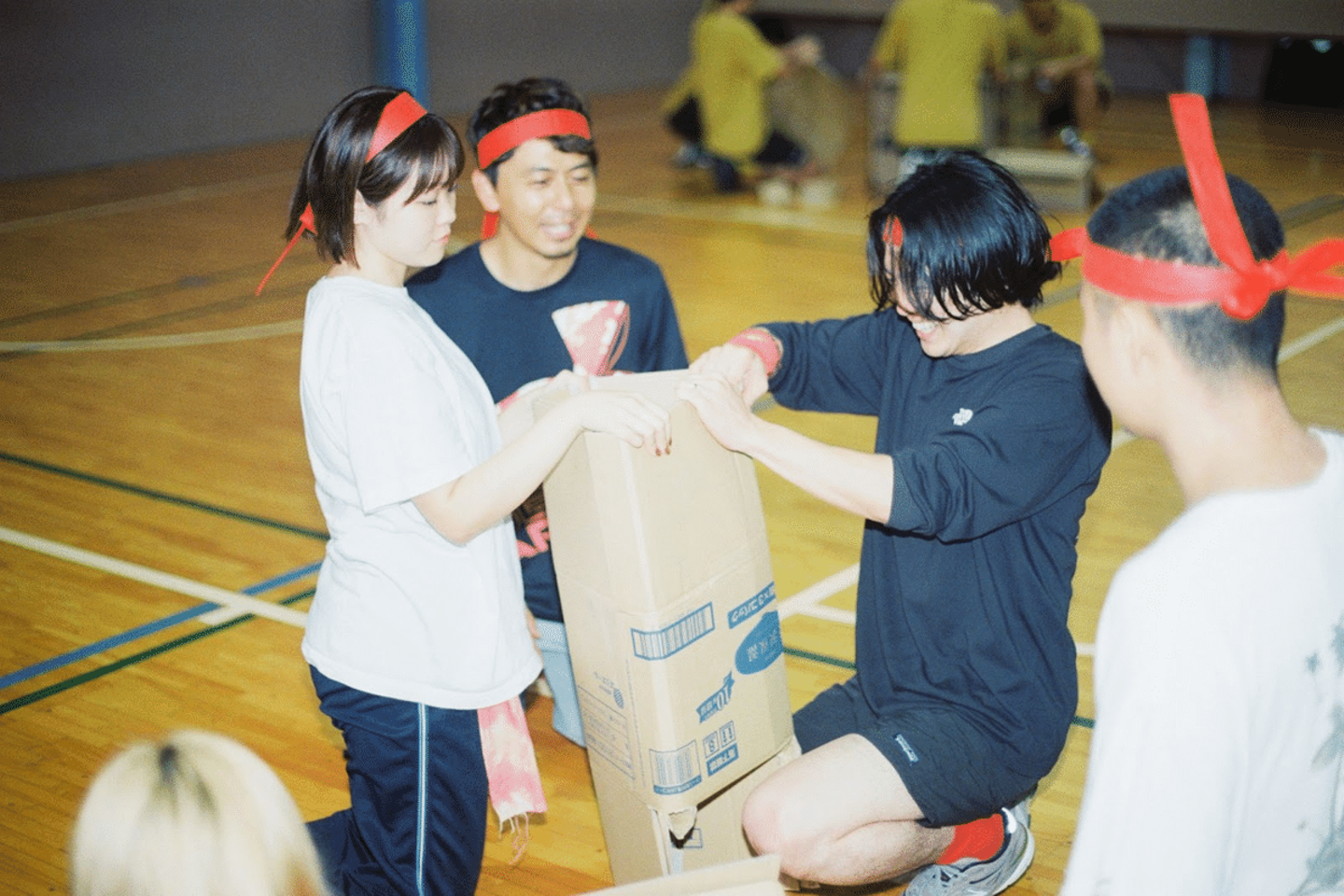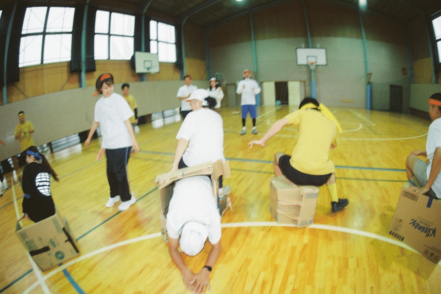 4チーム対抗の“椅子からつくる”椅子取りゲームで、制限時間と限られた材料から椅子をつくってプレゼンをし、クリエイティビティ・強度・企画・運動能力までが試される、斬新な椅子取りゲームでした。