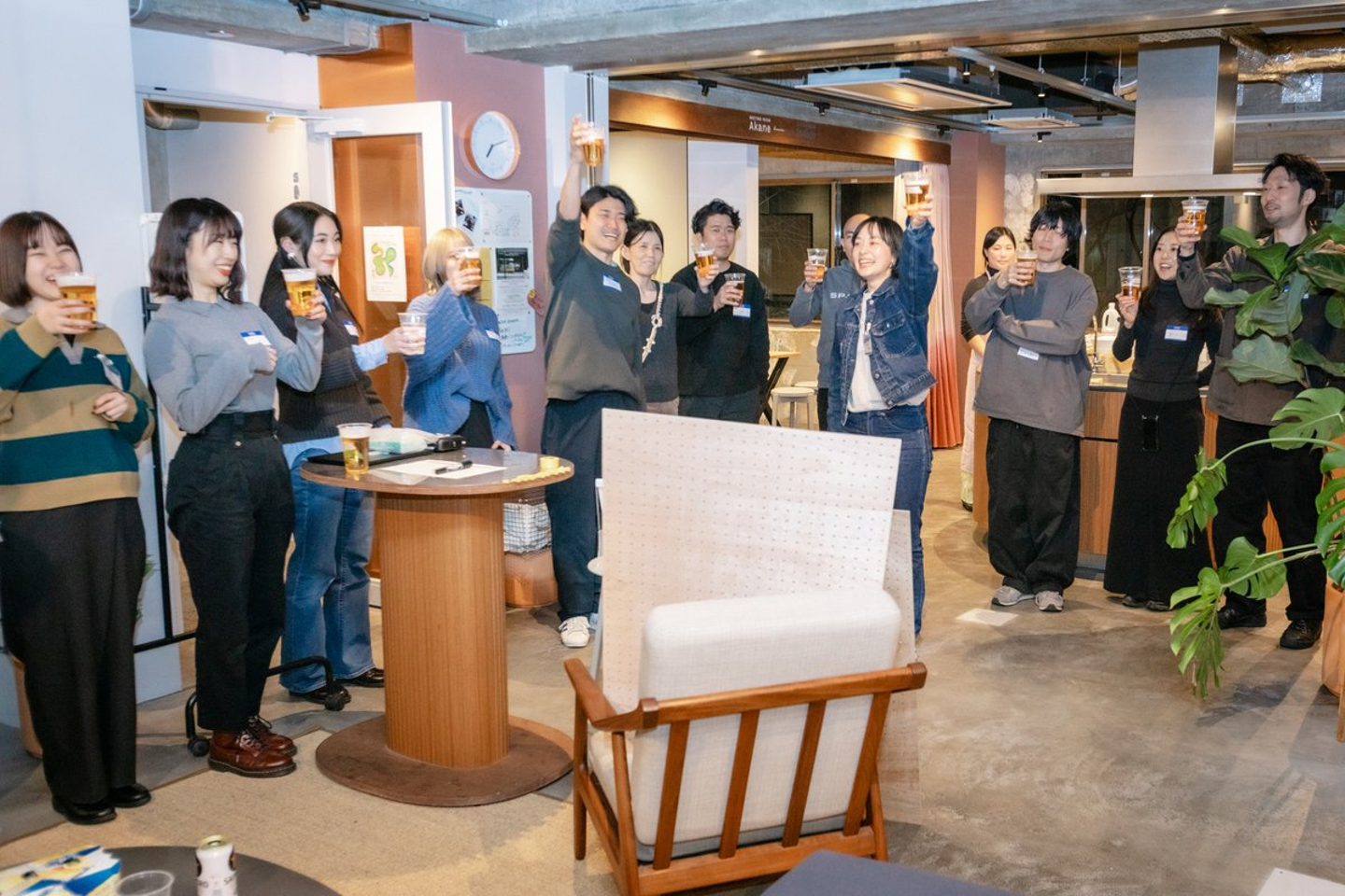 総会の後はSoil work Nihonbashi 1stに移動して、新年会!コミュニティマネージャーの乾杯から始まります!