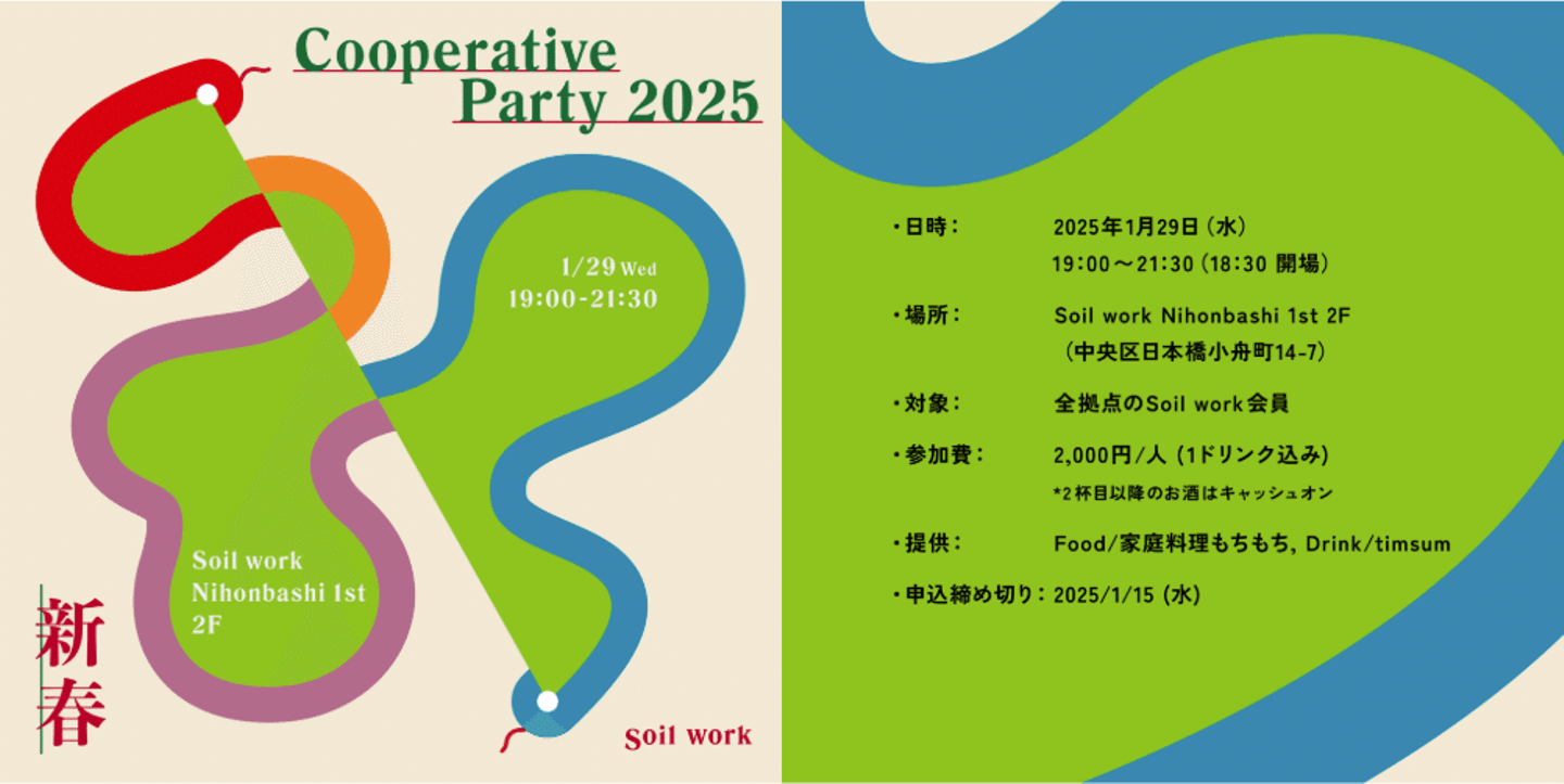 Cooperative Partyでは Stapleが運営するコワーキングオフィス、Soil workの会員さんも加わり、賑やかな会となりました。Soil work は現在、日本橋、秋谷、一宮、瀬戸田に拠点がありますが、3月からは京都に、5月からは伊豆にも拠点が増えます。今回の新年会は日本橋での開催でしたが、秋谷から足を運んでくれた会員さんも。建築デザインや教育、コンサルティングなど、さまざまな仕事に携わる人たちが、普段のデスクワークではなかなか出会えない異業種の人たちとつながれる場。新年のご挨拶もかねた、楽しい1年のスタートとなりました。