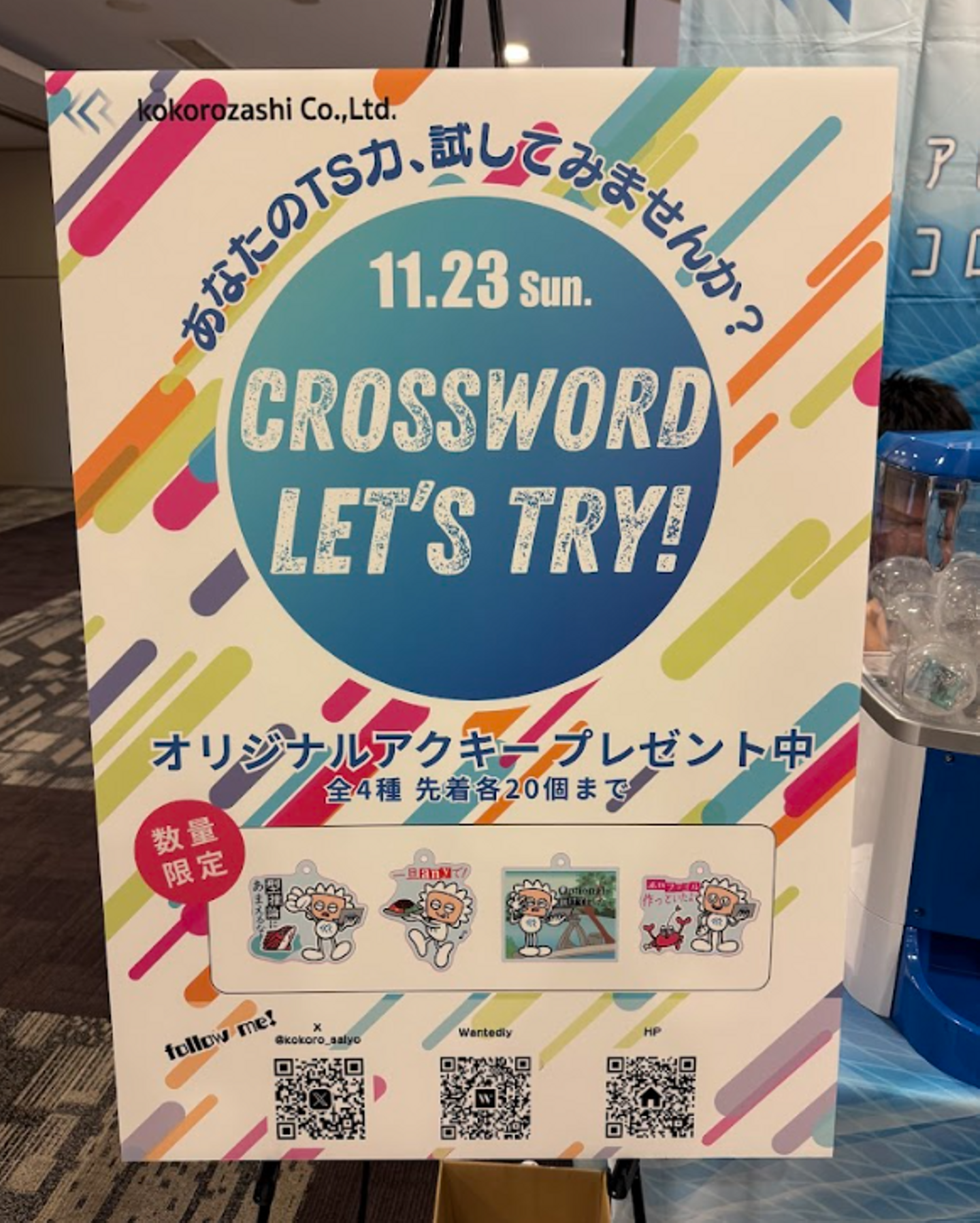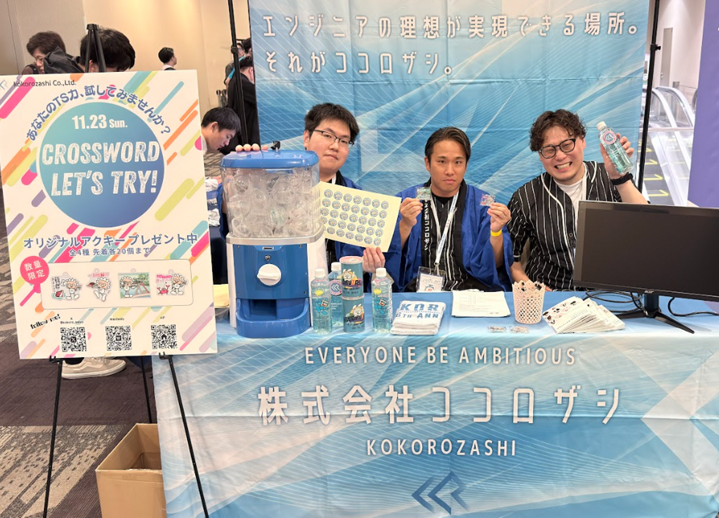 当日はスポンサーとしてブース出展をしました。私たちのミッションやサービスのご紹介をさせていただいたり、TSKaigiにちなんで、「TypeSciptに関するクロスワード形式のクイズ」と、ココロザシのキャラクターである"ココちゃん"の北陸バージョンのアクリルキーホルダーをご用意しました!