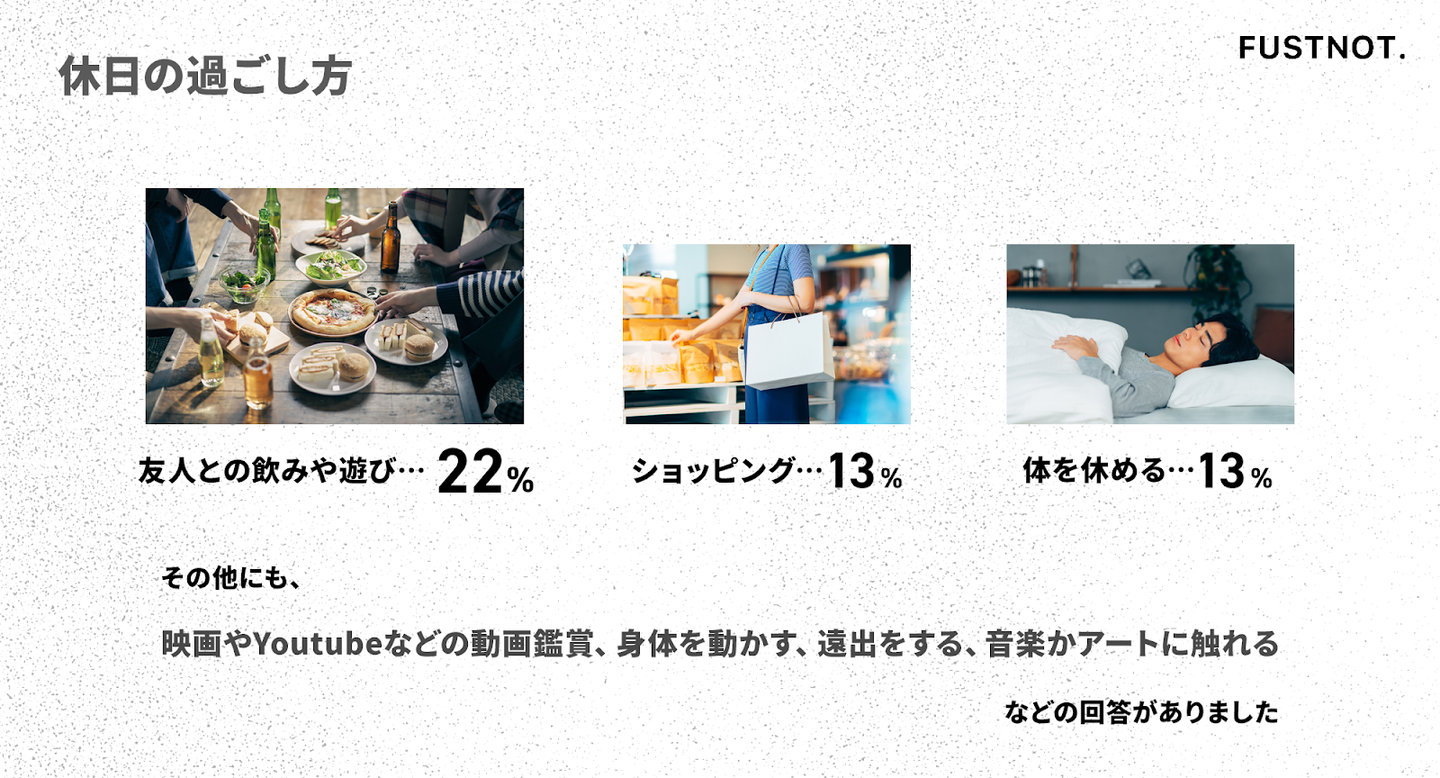 休日の過ごし方は実にさまざま。最も多いのは友人と遊ぶ(22%)、次いで買い物(13%)、ゆっくり寝る(13%)が人気です。その他にも映画やYouTube鑑賞、体を動かす、読書、音楽やアート、愛犬と過ごすなど、多彩なリフレッシュ方法が見られました。
