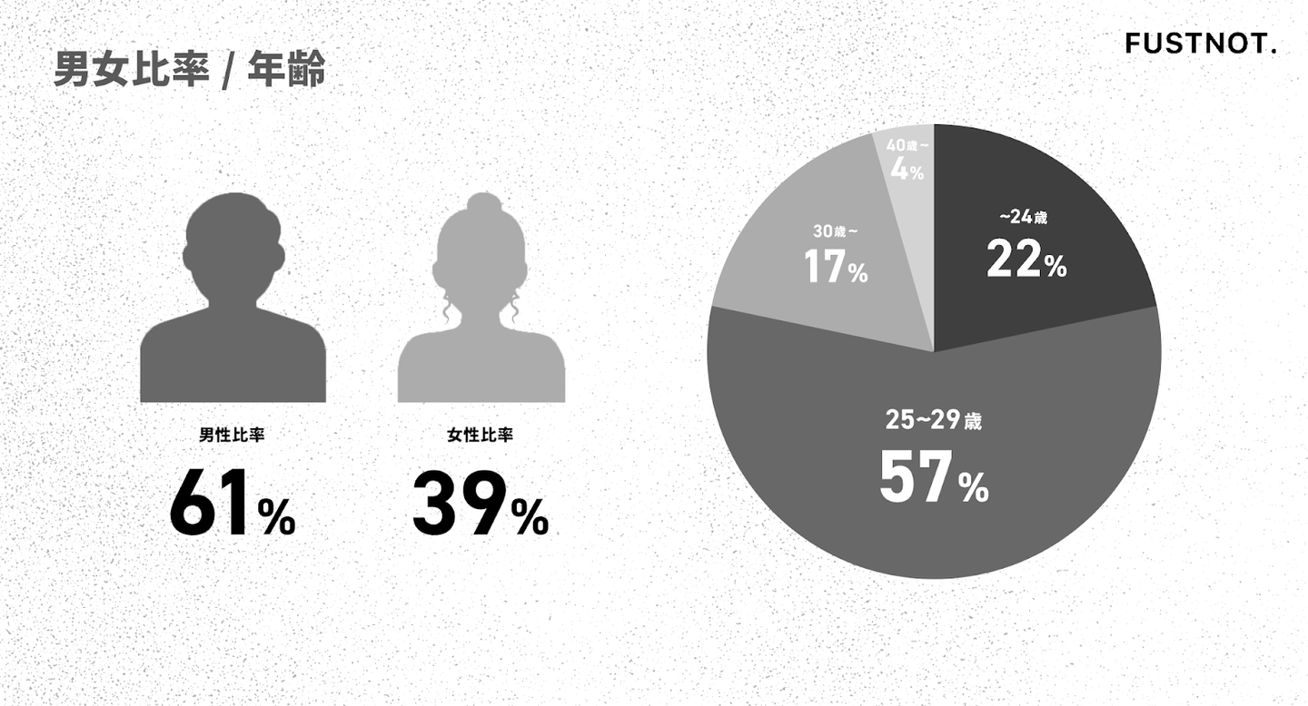 ファストノットは男性61%・女性39%とバランスが良く、性別や年齢にとらわれず挑戦できる環境が整っています。