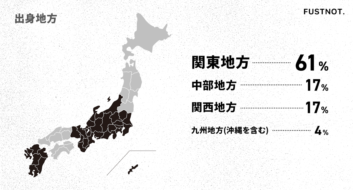 出身地は関東が61%と多いものの、中部・関西からも17%ずつ、九州からも4%のメンバーが集まっています。