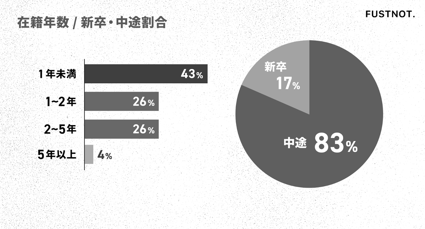 在籍1年未満のメンバーが43%と多く、急成長フェーズらしいフレッシュさが際立つ一方で、2〜5年・5年以上と腰を据えて働くメンバーも在籍しており、安定感と挑戦が両立する組織です。