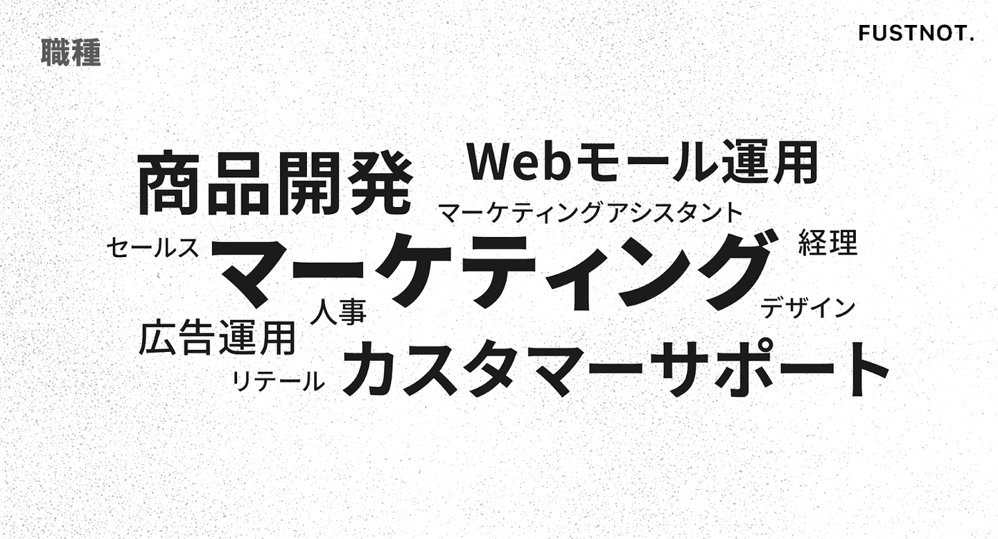 ファストノットを支える中心はマーケティングと商品開発。さらにCS(カスタマーサポート)やモール運用といった事業運営に欠かせないポジションに加え、広告運用、人事、バックオフィスなど専門職も揃っており、少数精鋭ながら幅広い職種が集まっているのが特徴です。