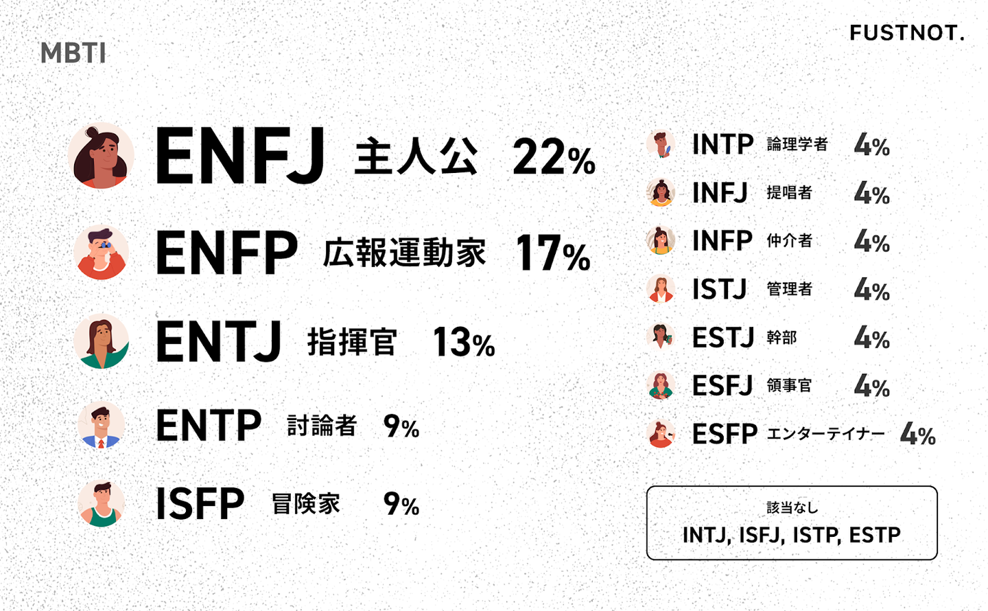 最も多いのはENFJとENFPで、人との関わりやチームワークを大切にするタイプが全体の約4割を占めています。実際「周りを巻き込んで挑戦する」「人にエネルギーを与える」メンバーが多く、ファストノットのカルチャーを象徴していると言えます。