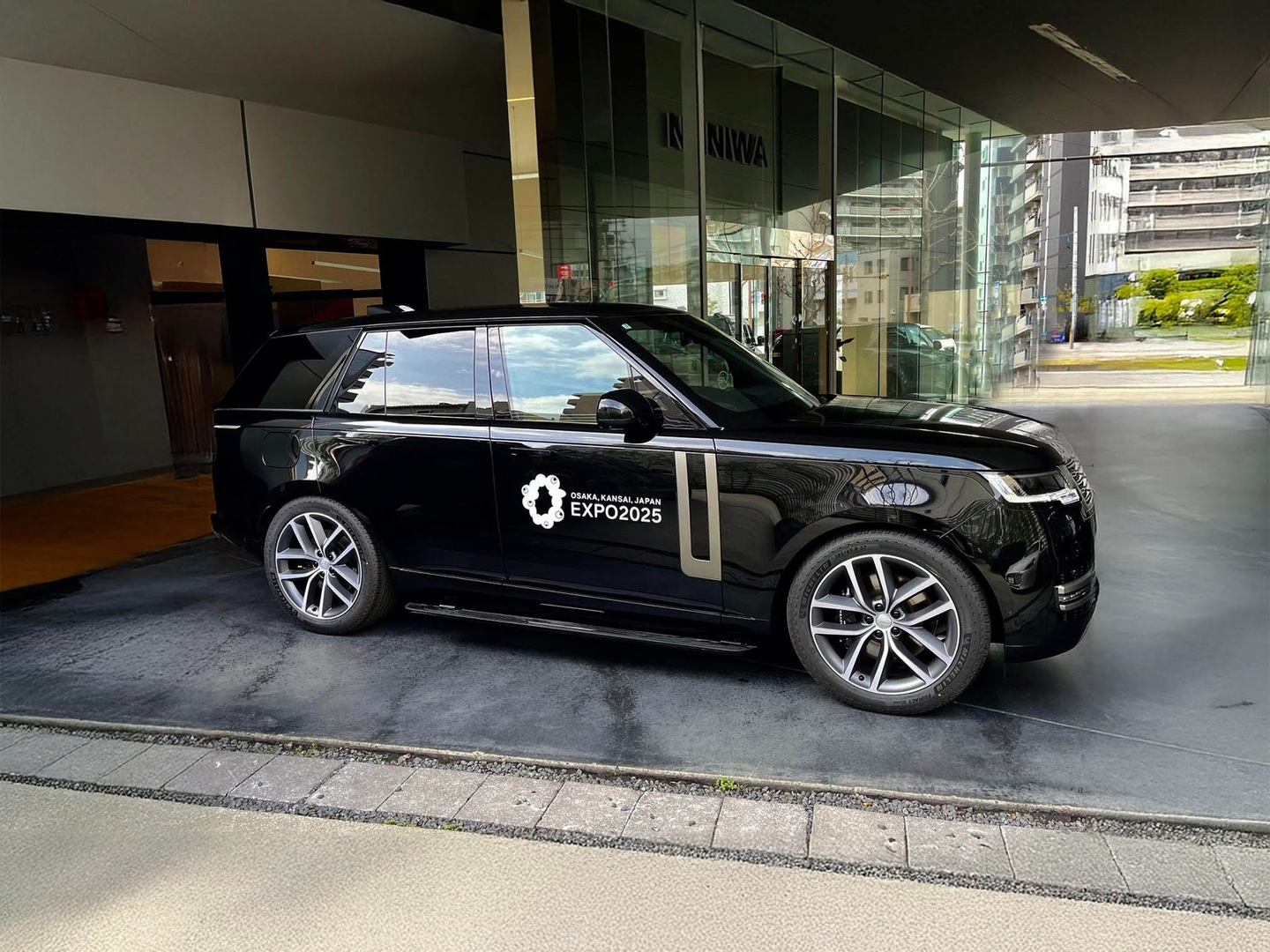 万博ロゴ入りのレンジローバーが、世界各国からのVIPゲストの送迎を彩ります