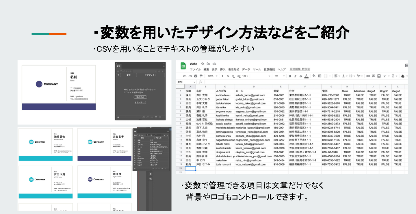 まずGoogleスプレッドシートでCSVデータの作成を行い、Illustrator側での読み込みデザインに流し込む方法を解説。その後、不透明度マスクを用いたデザインの活用方法を実際の画面を見ていただきながら説明していきました。