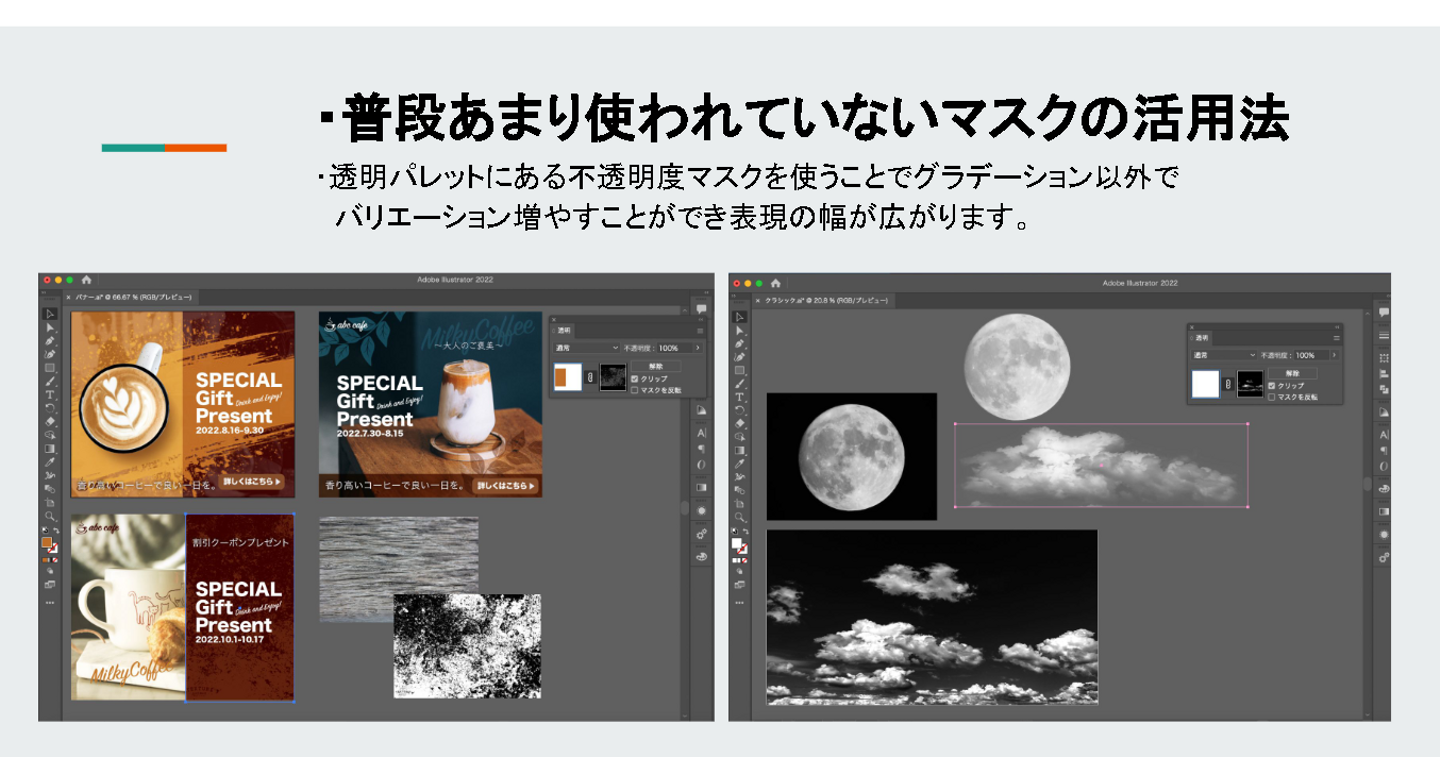 もともとマスク機能関係の基礎知識はあったのですが、それでも学ぶことが多かったです。実際のバナー制作を見せてもらいつつ、マスク機能で簡単にニュアンスを変えられる様子を見ることができました。デザイナーを目指す人には有料級の講義だと感じました!