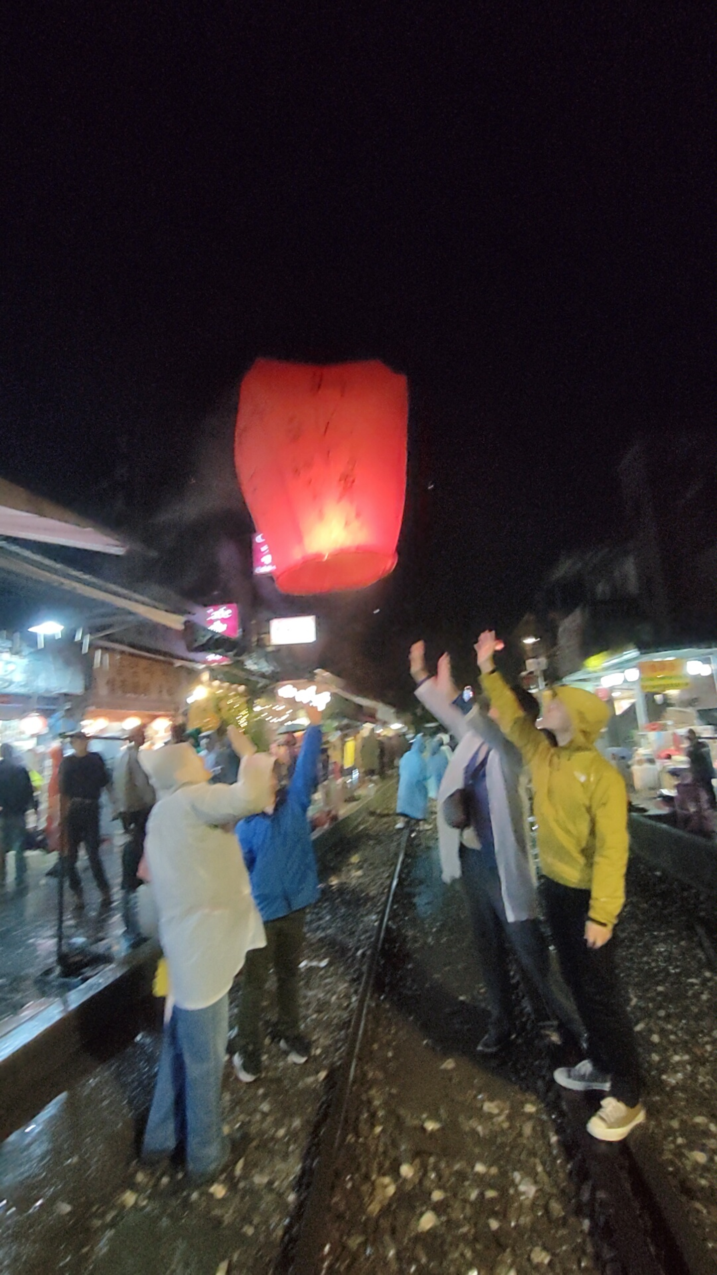 まず向かったのは十分。ランタン上げが有名なエリアです。十分老街の線路際にたくさんのお店が並んだ商店街のような場所で、願いを込めてランタンを飛ばします。私たちも、ガイドさんの案内でランタン上げに挑戦しました!