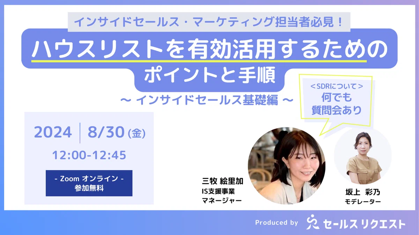 インサイドセールスを導入したばかりの企業様や、施策に行き詰まりを感じハウスリストを見直したい企業様、今後の課題解決のヒントを得たいといったご担当者様は奮ってご参加ください!