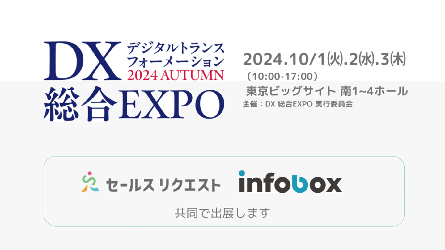 株式会社セールスリクエストは、2024年10月1日(火)・2日(水)・3日(木)に東京ビッグサイトにて開催される「DX 総合EXPO」に、営業データプラットフォームを提供する株式会社インフォボックス(本社:東京都千代田区、代表取締役:平沼海