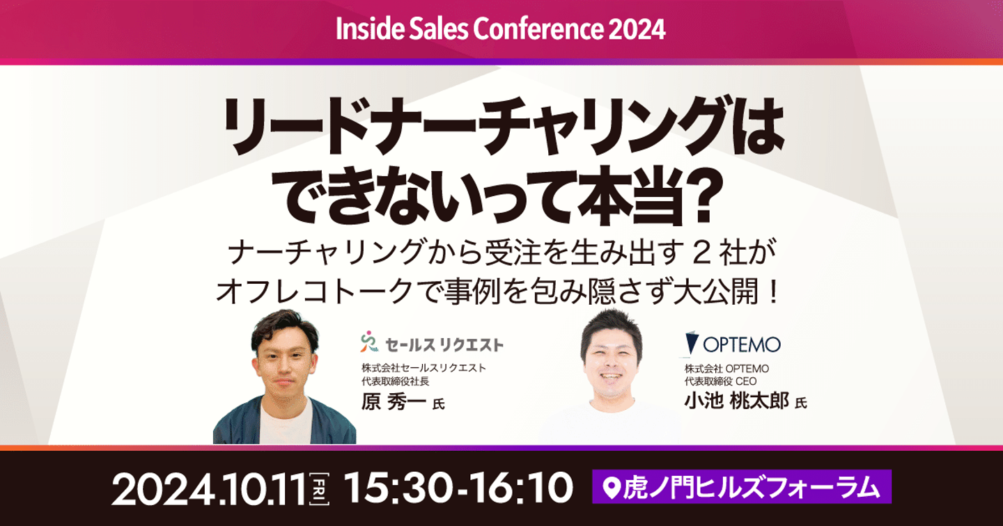 2024年10月11日(金)に虎ノ門ヒルズフォーラムにて開催される「インサイドセールスカンファレンス2024」に、セールスリクエストが「GOLDスポンサー」で協賛させていただきました。