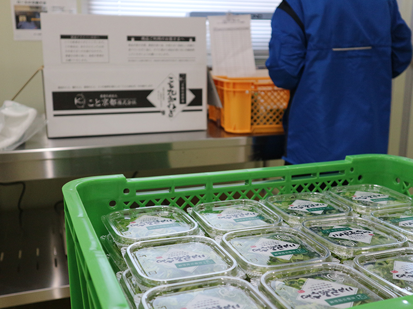 出荷作業されている軸丸さんの後ろ姿と、お店へ発送されていく「こと九条ねぎ」たち。