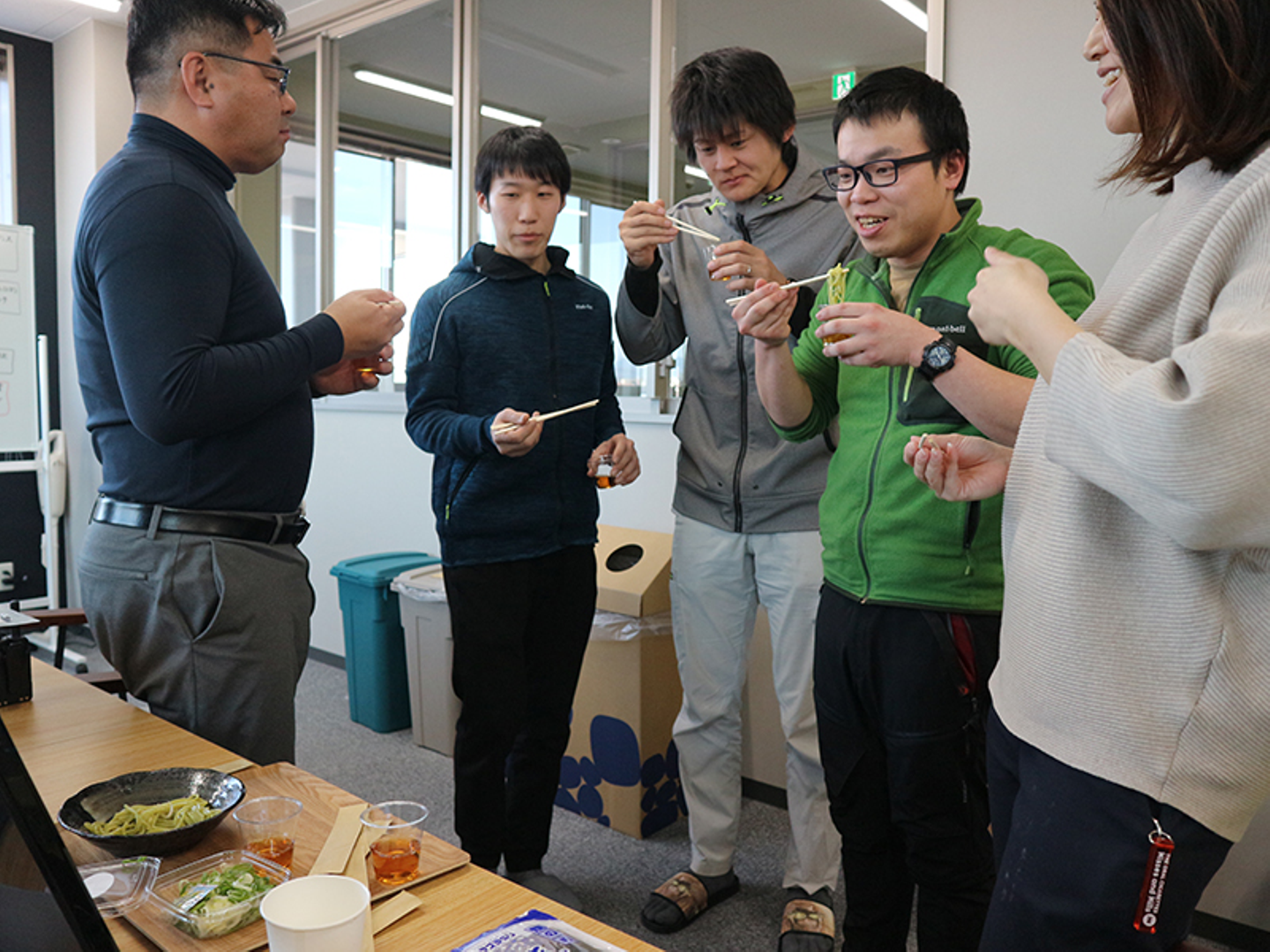 山田リーダーが試作品を持ってこられ、急に試食会がスタート!九条ねぎを練りこんだ「うどん」とのことで、商品化するかも…?