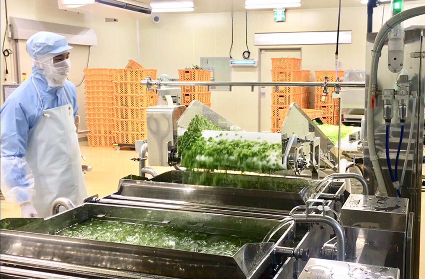 カットねぎ洗浄の工程で問題がないかチェックしている中西さん。