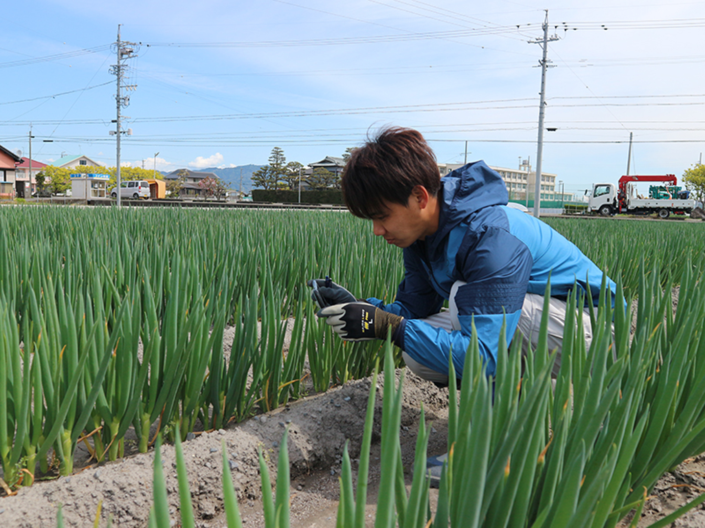 工場の近くでは九条ねぎではなく、白ねぎを栽培中!生育状況をカメラで記録する吉田さん