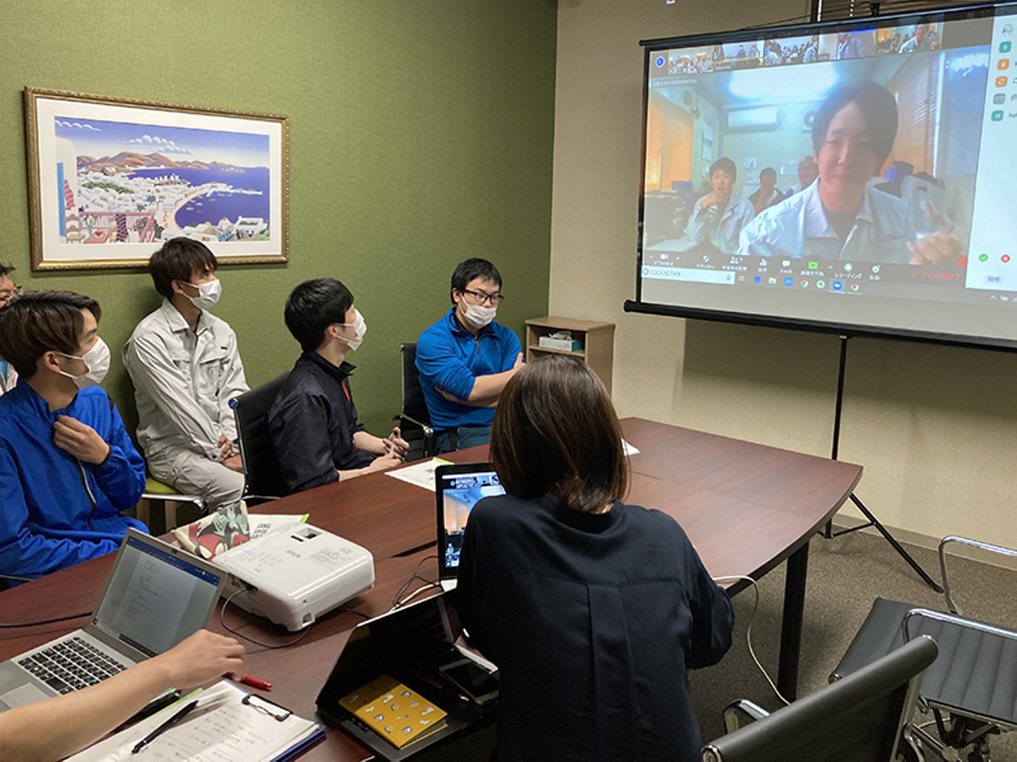 月に一回、社員全員が集まる「全体会議」はWEB会議に!京都府内4か所と静岡、それぞれの場所からアクセスし、「おーい、聞こえますか~?」と事前チェック中。