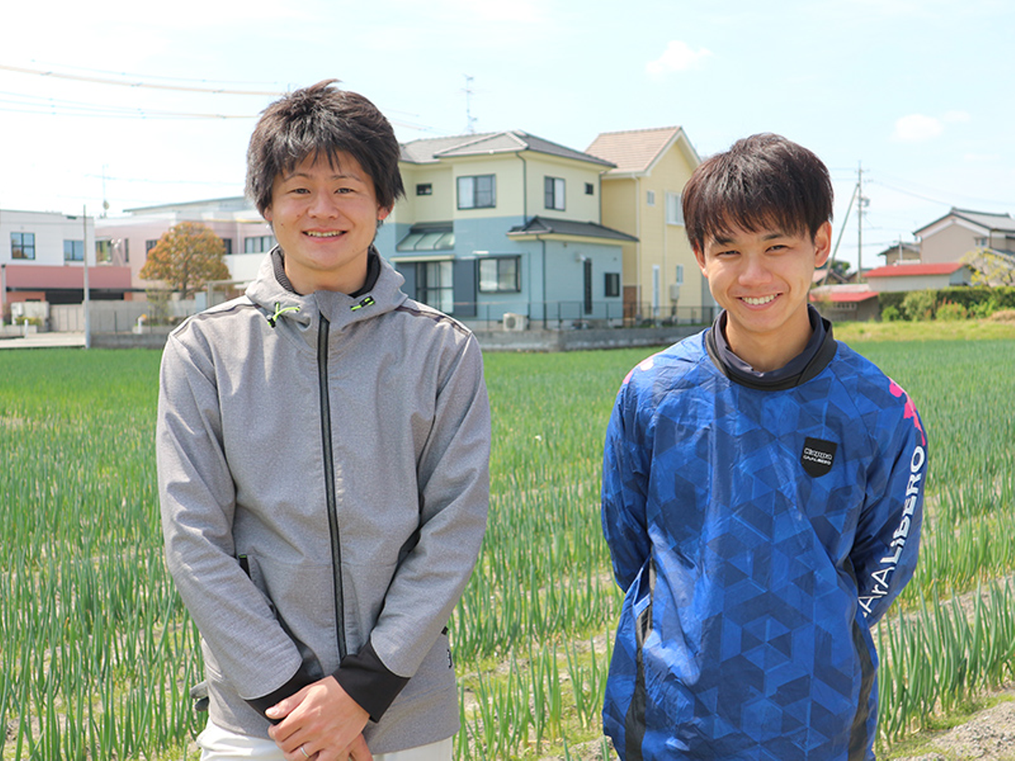 左:元アメフト部タイトエンド。よく畑で動物とお話をしている、ノッポの「山田農場長」