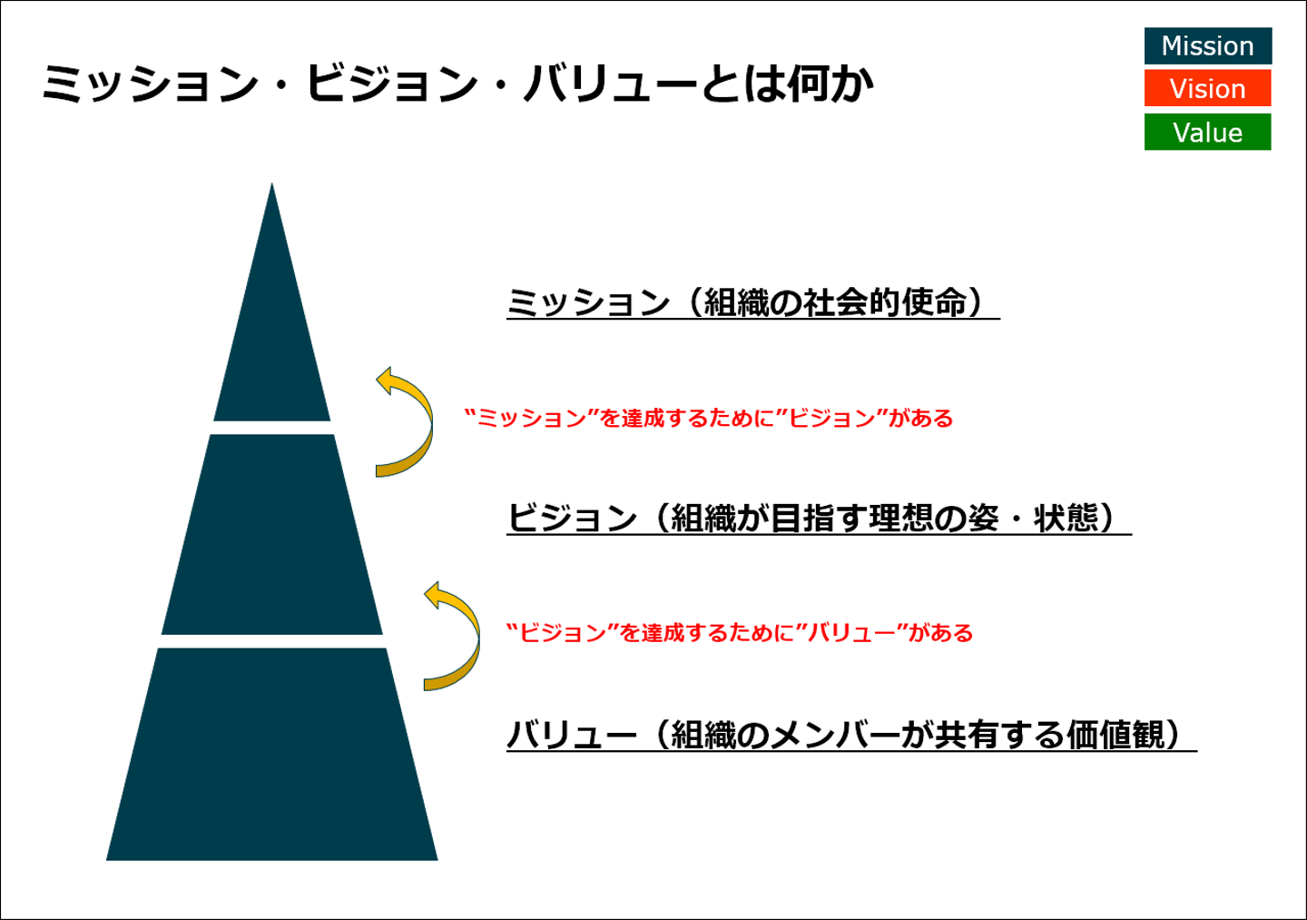 ミッションが最上位であり、それを達成するためのビジョン、ビジョンを達成するためのバリュー、