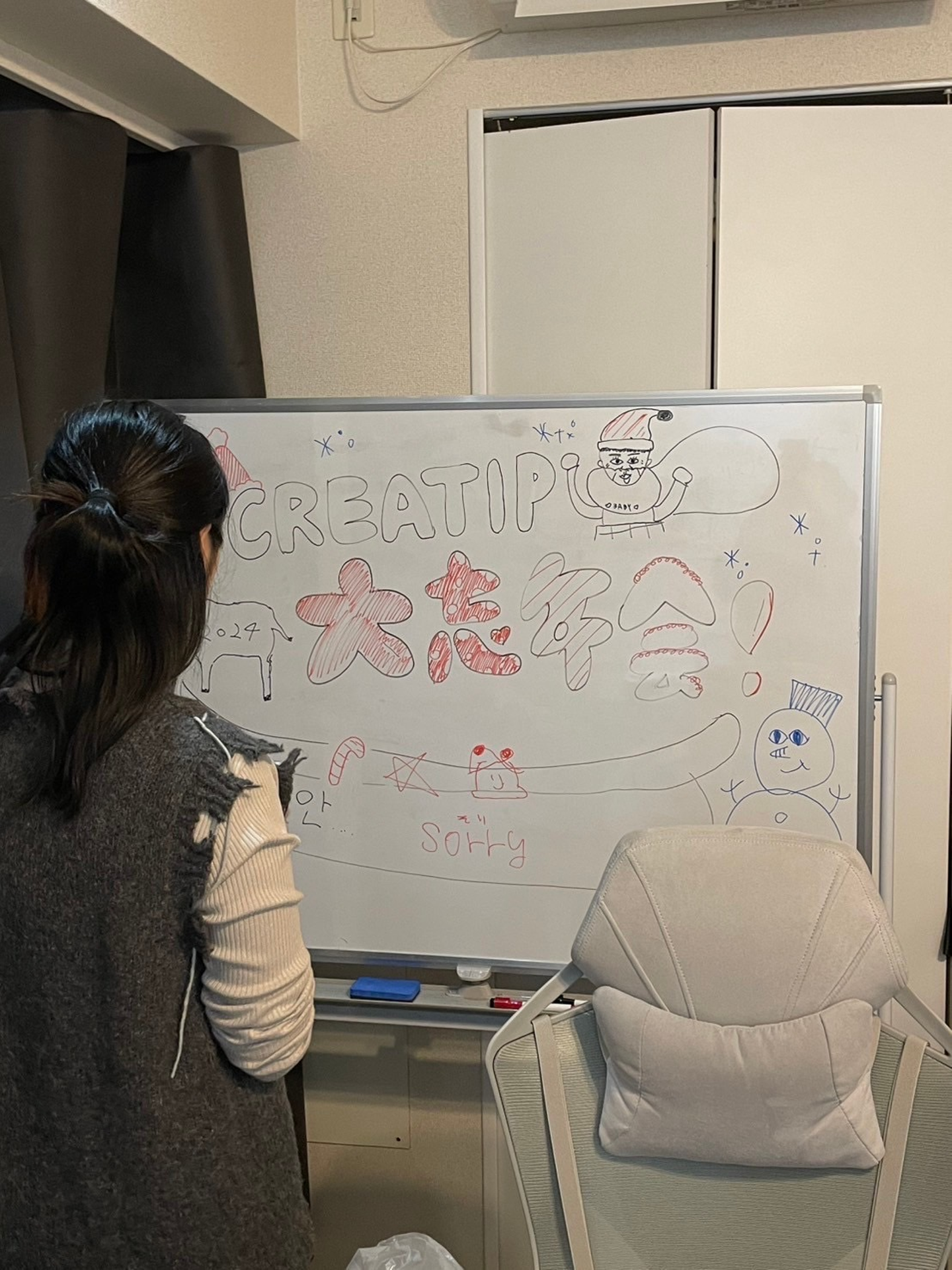 ・この間オフィスで忘年会を開きました!上の変な絵はだれが書いたんでしょうか…?