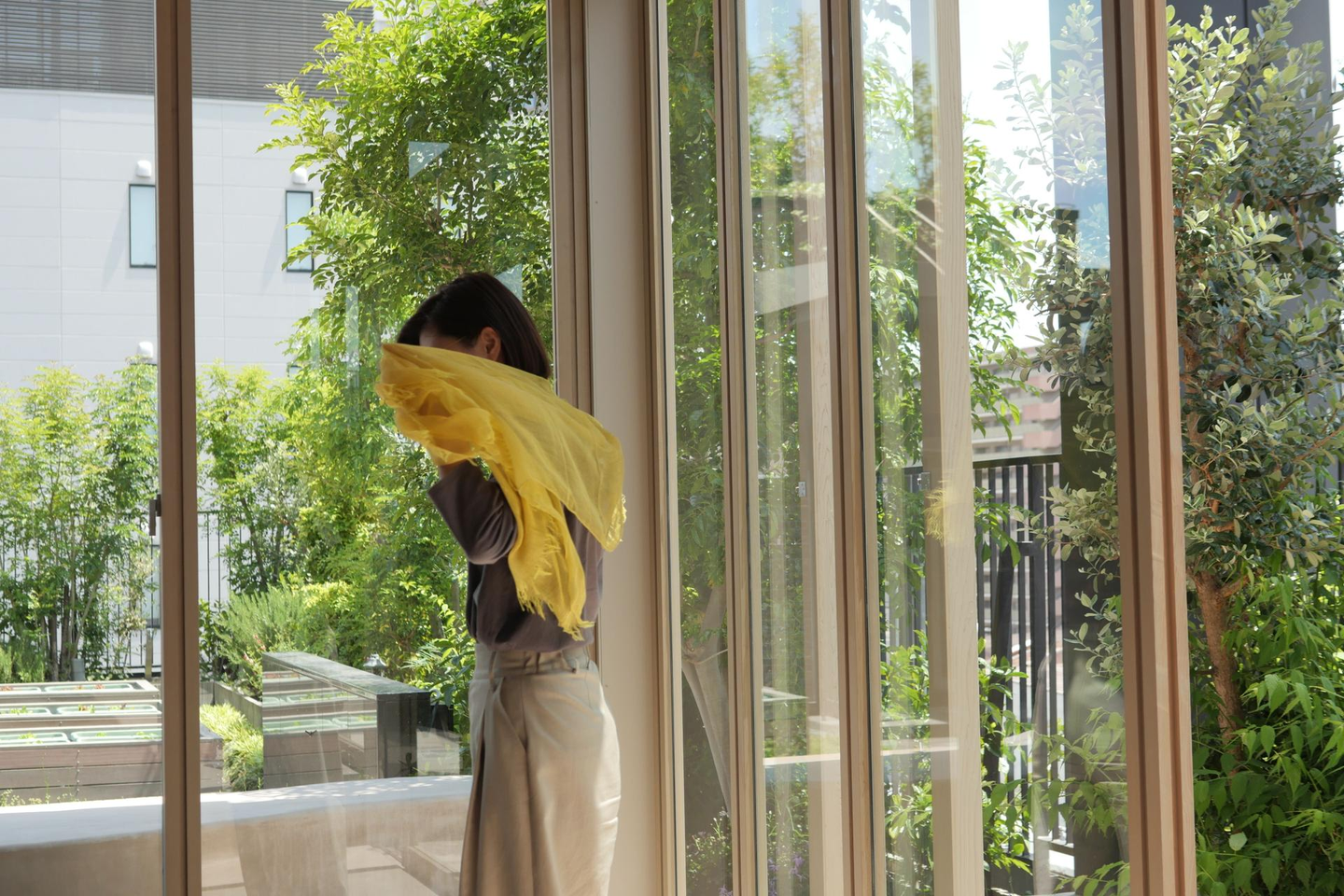 先染めという技法で染められた糸を、専用の織機で縦・横と織られてつくられたストールは