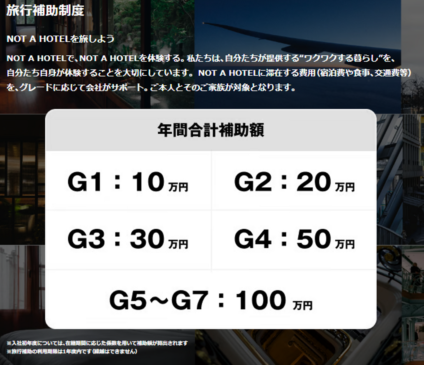 社員は、NOT A HOTELに割引価格で宿泊できることに加え、最大100万円の旅行補助があります。