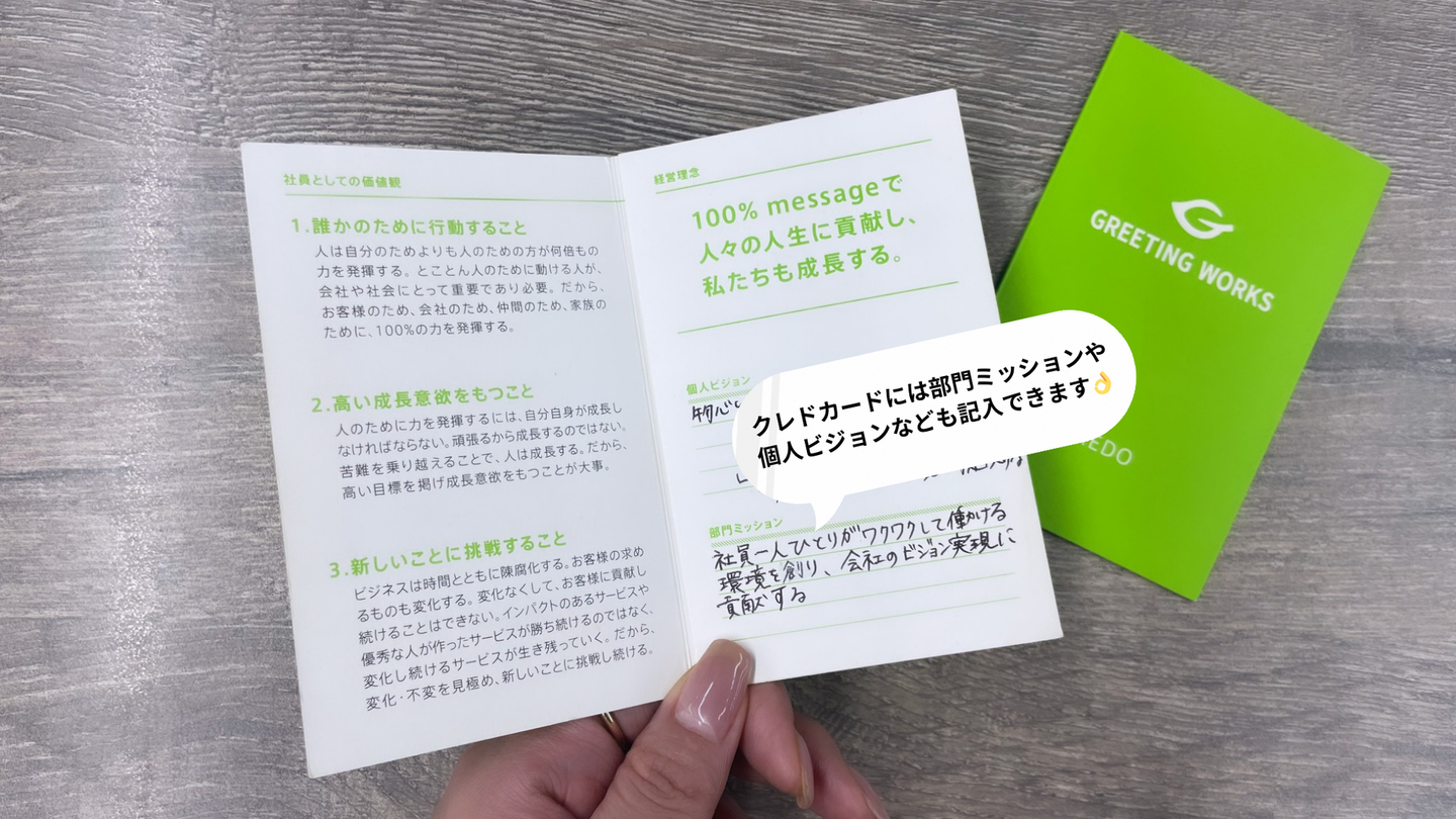 だからこそ、GREETING WORKSのメンバーとなったその日に、社長から改めて会社が大切にしている理念・価値観についてお伝えしています。