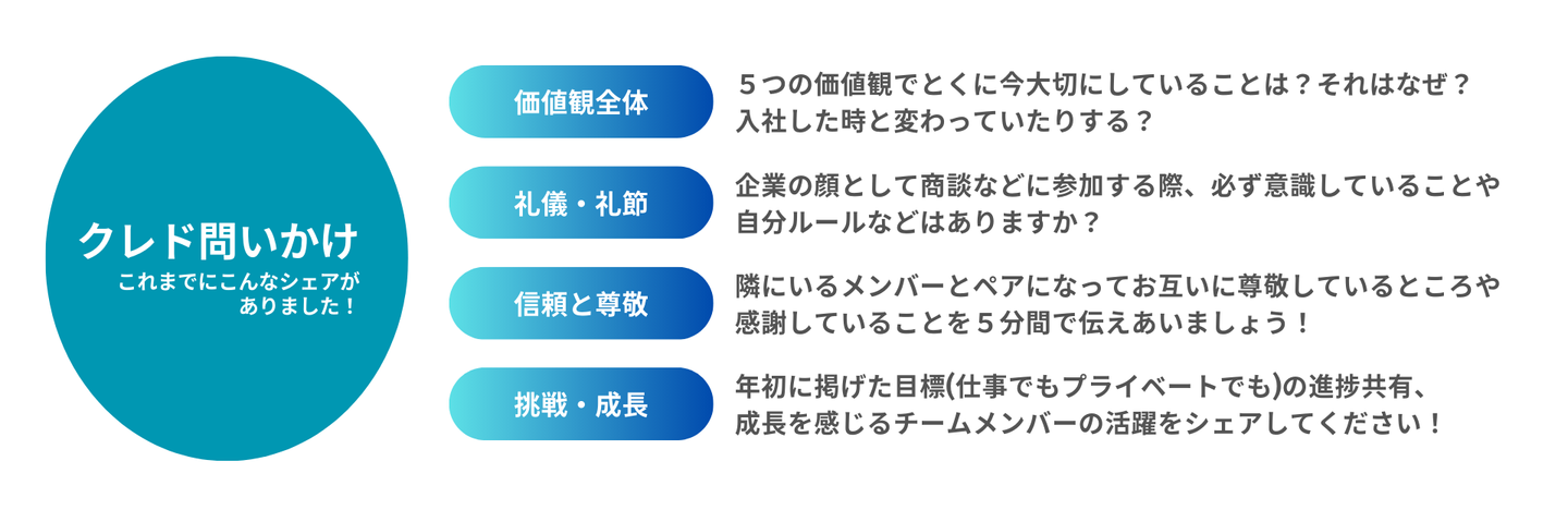 この朝礼内でのクレドは順番にまわってくる「クレド当番」が、5つの価値観の中から1つの価値観にスポットを当て、自分の考えをシェアしたり、他のメンバーにに問いかけを行ったりします。