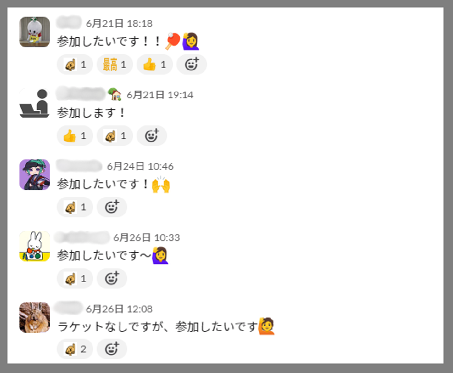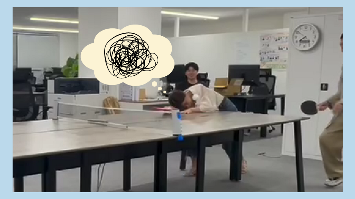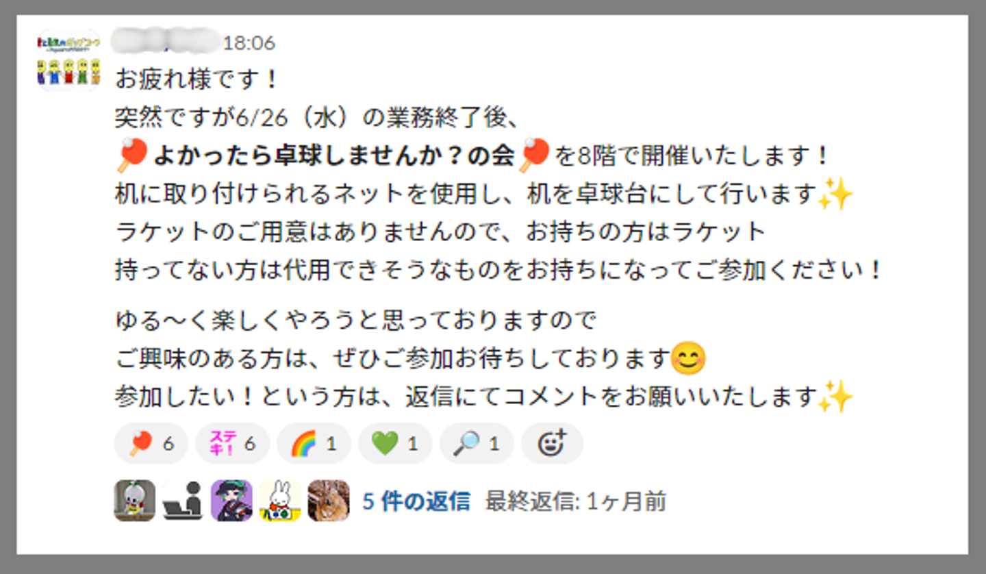 とある日の夕方、社内チャットツールの全社チャンネルに流れてきたのは、経営管理課Mさんからの卓球のお誘い。