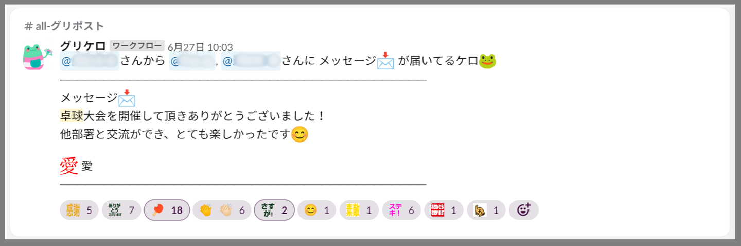 翌日、この卓球大会開催に対する感謝のグリポストが🐸🍬✨
