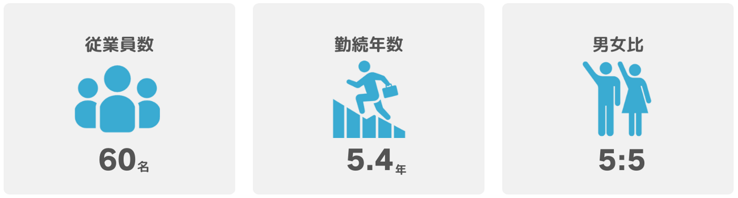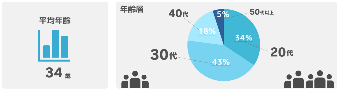 勤続年数は平均が約5年ほど。今年入社のフレッシュ組から、もうすぐ勤続20年の大ベテランさんまで幅広く在籍しています。年齢は20代~30代がメインになっていますね。