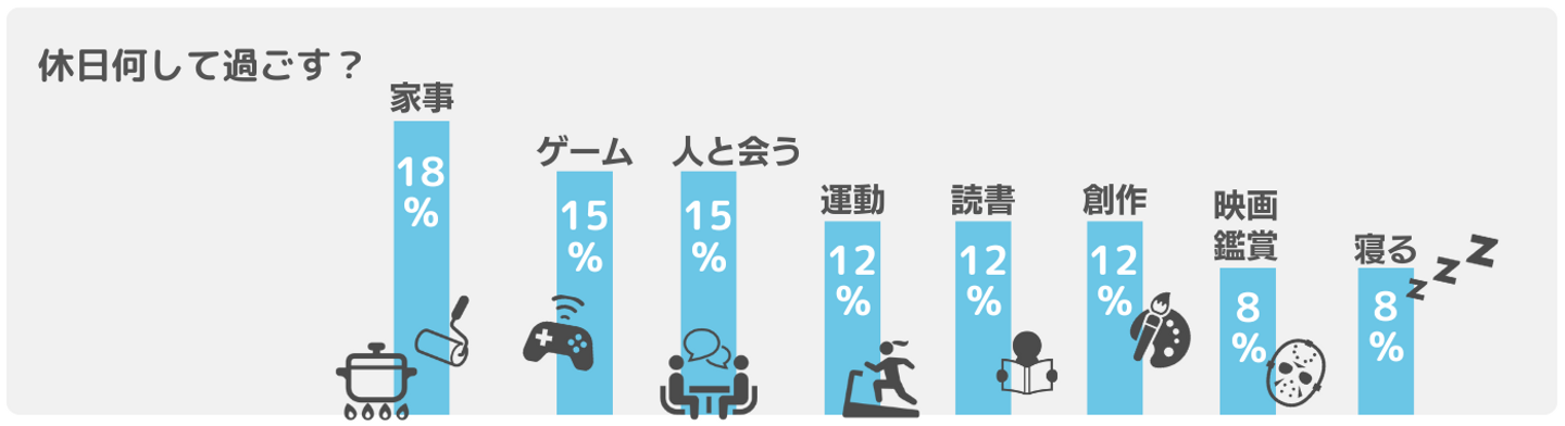 1位が家事。掃除や1週間分の食材を買い込んだり、料理をしたりというお声が多かったです。社内にはゲーム好きが多いことも浸透しており、定期的にオンラインで集まってはプレイを楽しんでるそう🎮!人と会う(友人と会う、飲みに行くなど)が多いのもGREETING WORKSらしいなぁという印象です👥✨