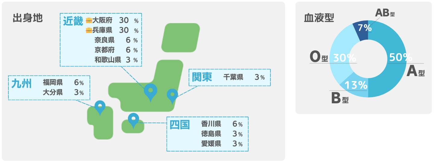 大阪に拠点を置くGREETING WORKS。図を見ると、圧倒的に大阪&兵庫出身のスタッフが多いですね😲血液型は日本人の割合とほぼ同じになりました💉🩸