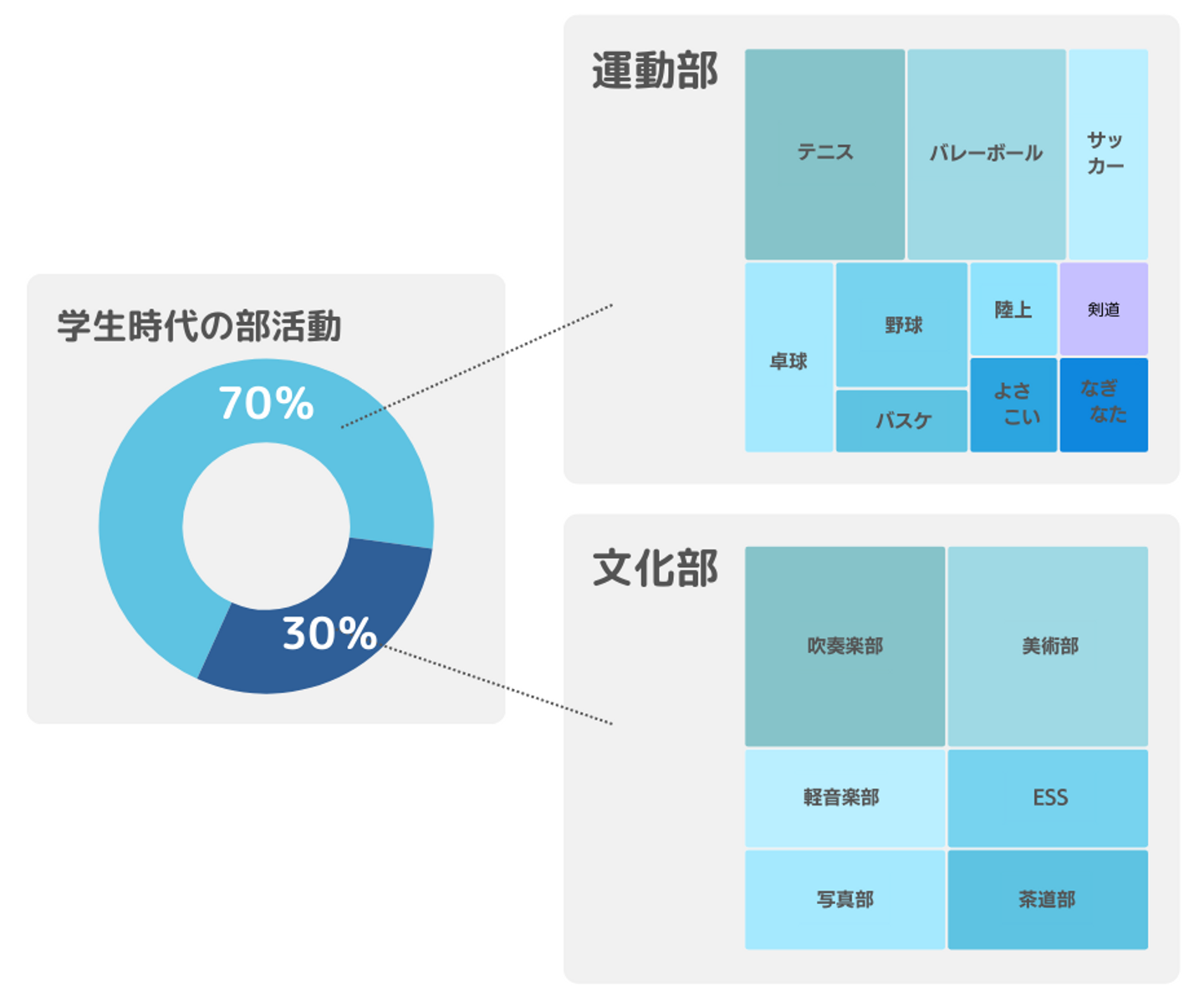 学生時代の部活動はこんな感じ。運動部の方が割合高く、分布図だとバスケットボールは運動部の中でも5位くらいですが、現在GREETING WORKSではバスケブームの兆しを感じています(笑)