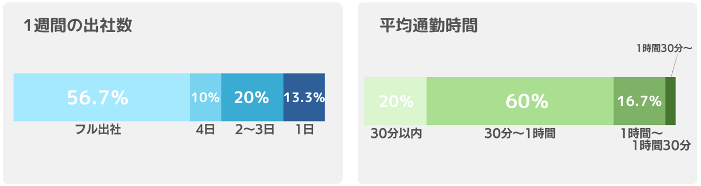 1週間の出社は約半数以上がフルの週5日だということが判明😯!!GREETING WORKSは全部で8部門あり、その部門により、基本出社orリモートで勤務体制が異なります。