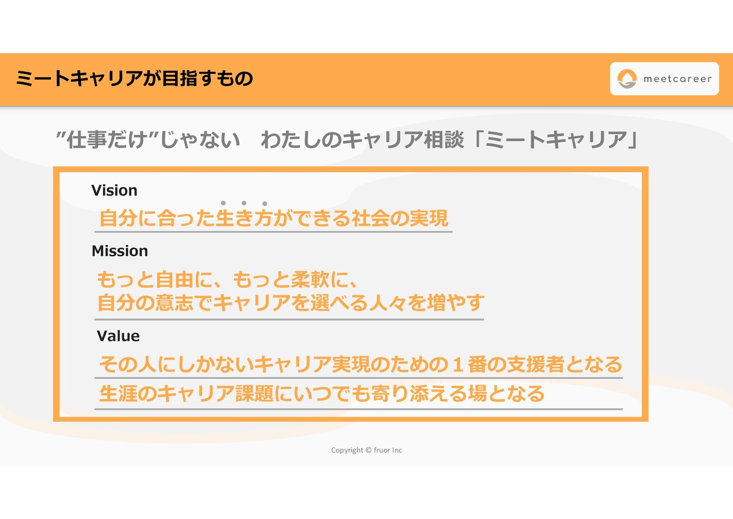 2019年11月に「自分に合った働き方ができる社会の実現」をビジョンに掲げ、求人紹介をしないオンラインキャリア相談としてサービスリリースをした「ミートキャリア」。