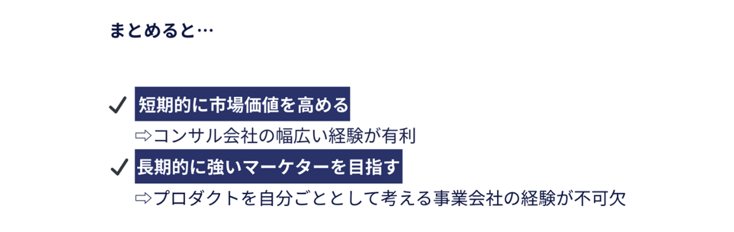 事業会社で一度プロダクトに深く関わることで、コンサルで培った幅広さがさらに活きる。両方を経験することで、一流のマーケターに成長できるはずです。
