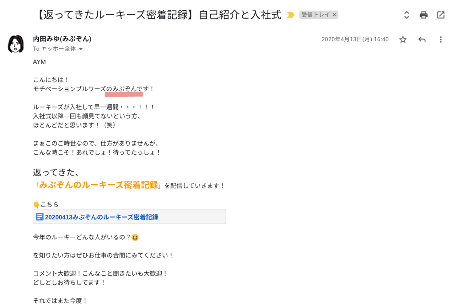 ニックネーム制のヤッホーでは、社内向けのメールもこんな感じ。