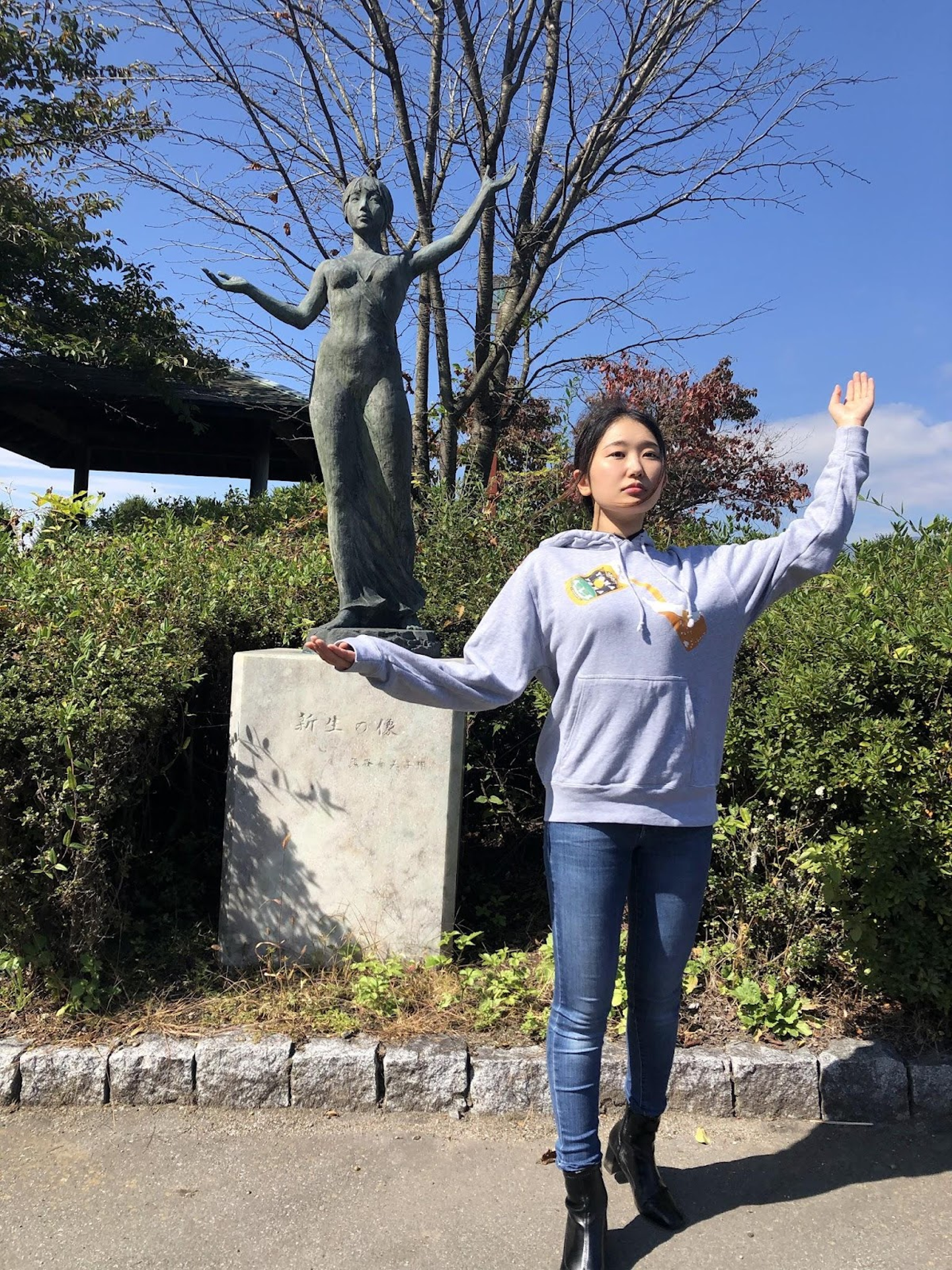銅像と同じポーズで写真を撮る趣味があり、オフィスの近くにある像と撮りました。