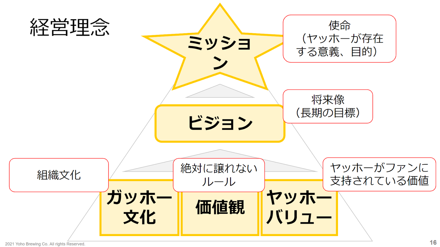 ヤッホーブルーイングが経営理念を大切に考え、社員一人一人が日常的に使っている様子が少しでも伝わっていると嬉しいです。さて、前置きが長くなってしまいましたね。お待たせしました。ここから、実際のヤッホーブルーイングの経営理念についてご説明します。